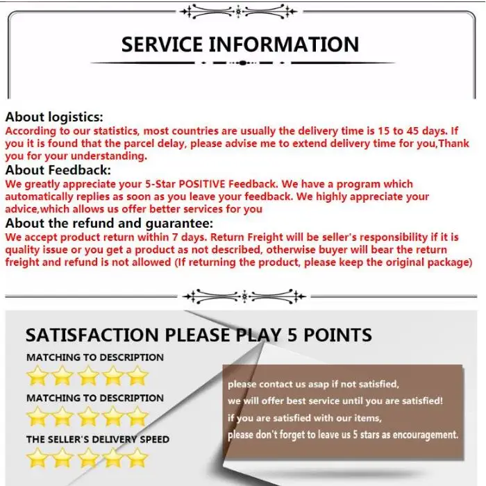 • If you did not receive the product within the guaranteed time( 45 days not including 2-5 day processing) you can request a refund or a reshipment.