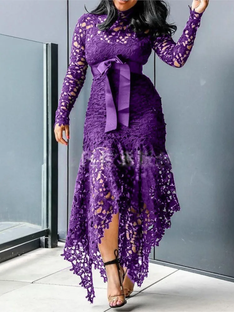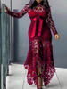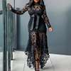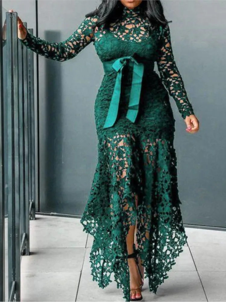 2024 Spring New Fashionable French Lace Stand Up Collar Bubble Sleeves Waist Cinching Slimming Dress Elegant Long Dress