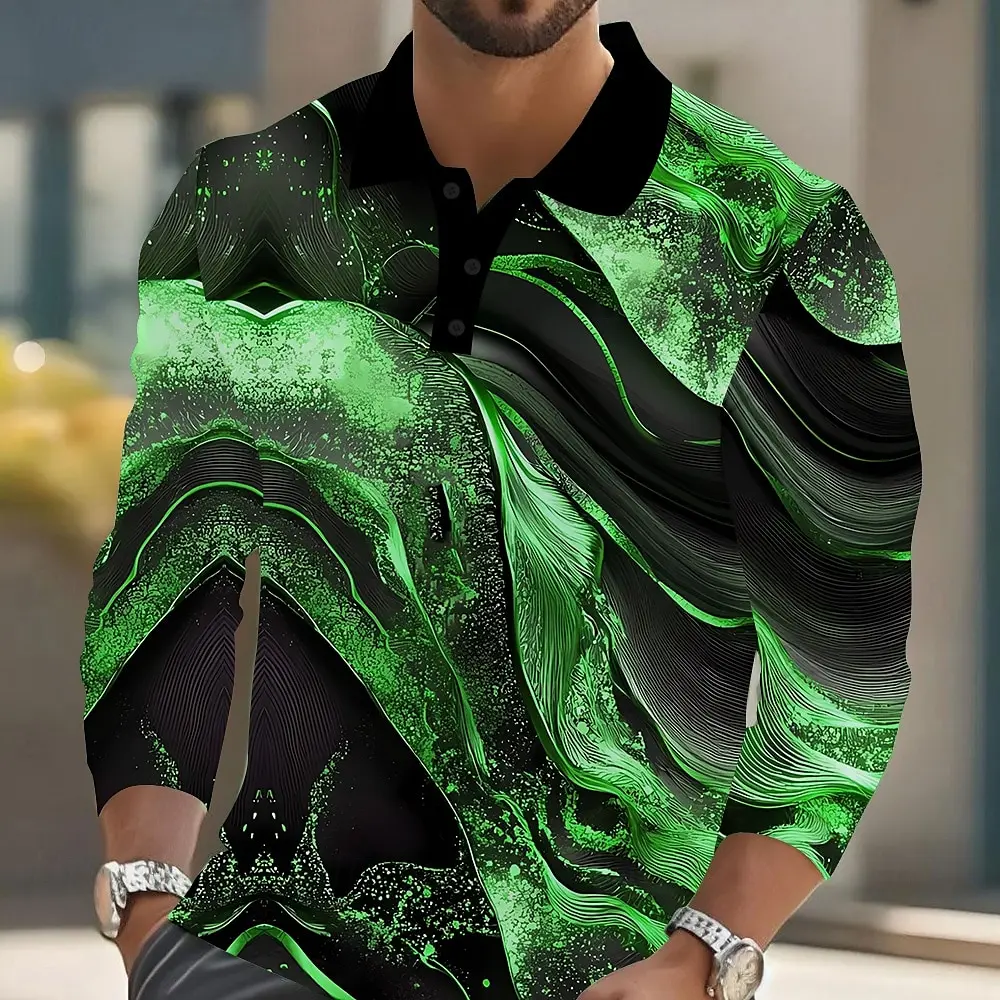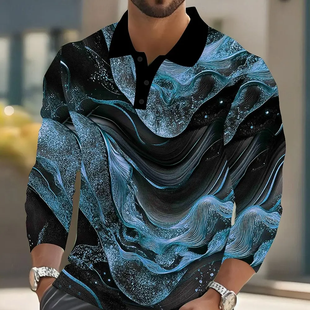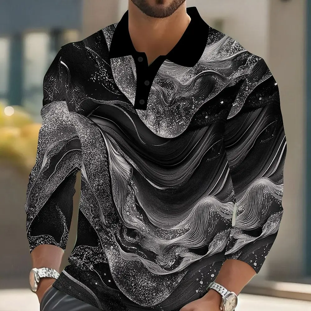 2025 Men’s Abstract Marble Long Sleeve Polo Shirt Breathable Business Casual Top Slim Fit Quick Dry Multi Colors Fall Winter