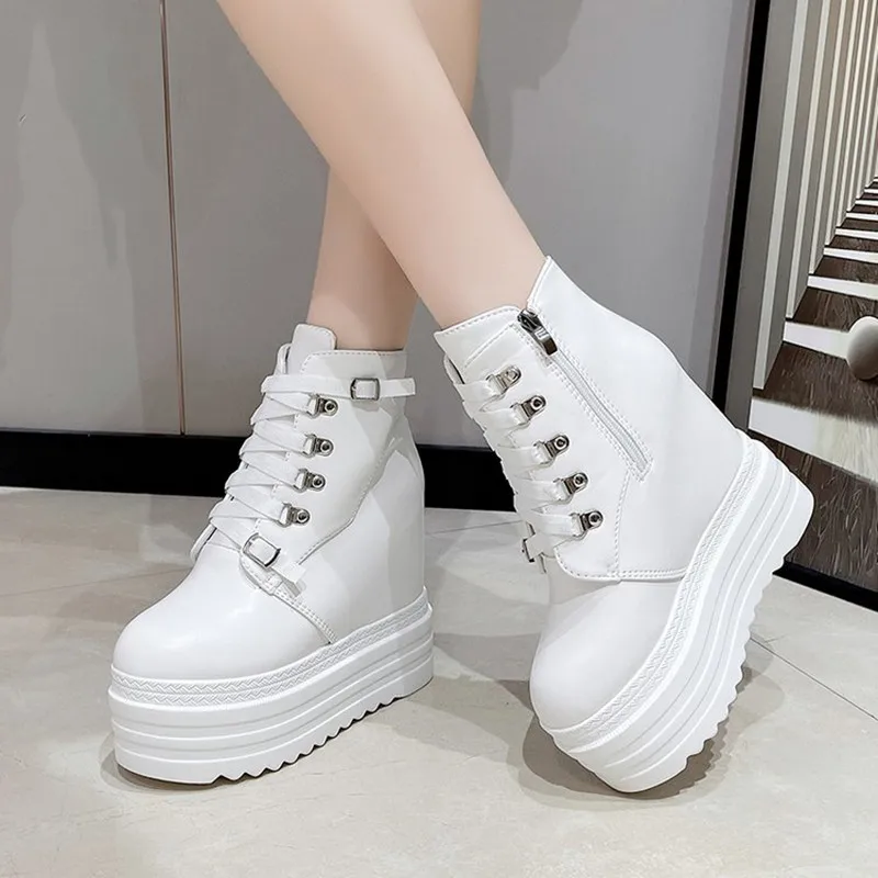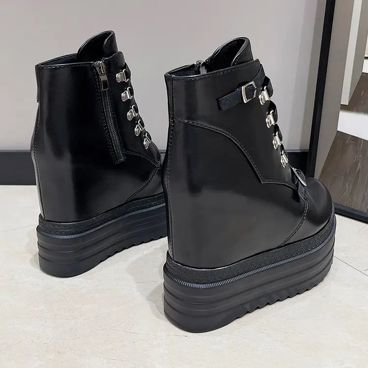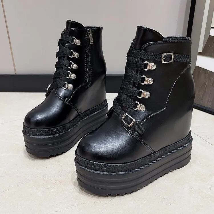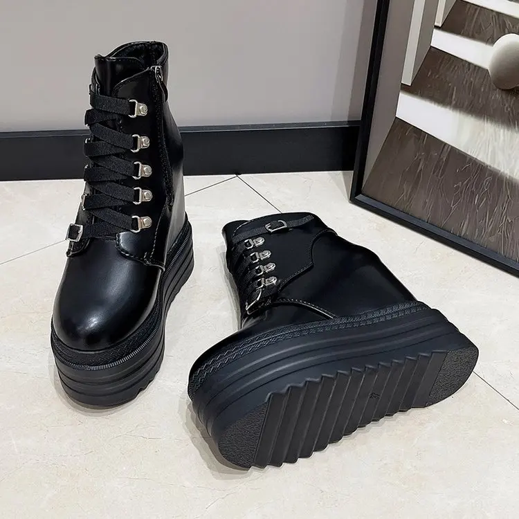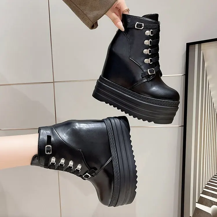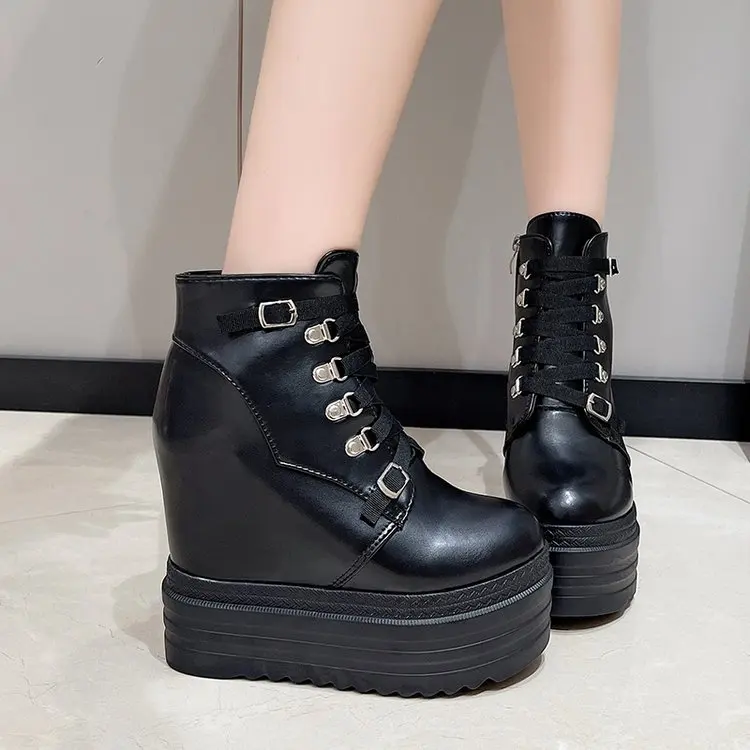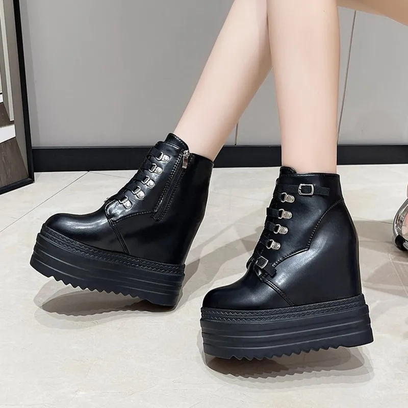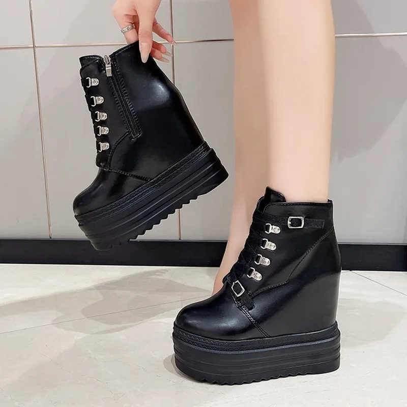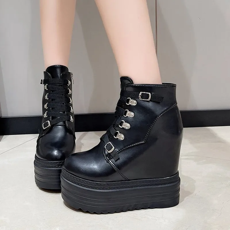 2025 New Fashion Designer Punk Style Women 12CM Platform Wedges Boots Autumn Soft Leather Female Lace Up High Heel Gothic Shoes