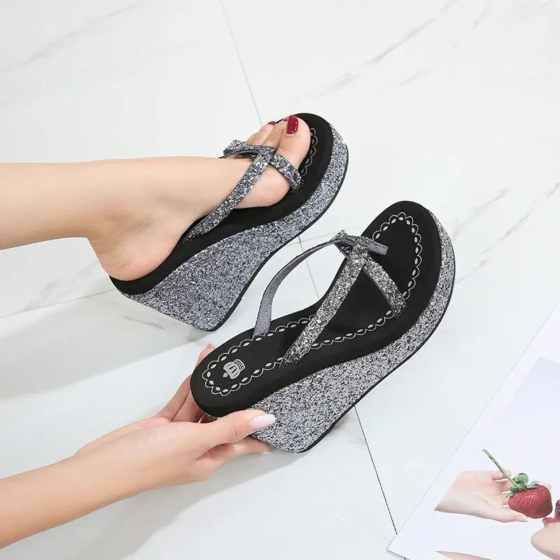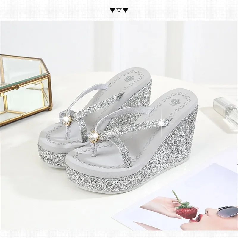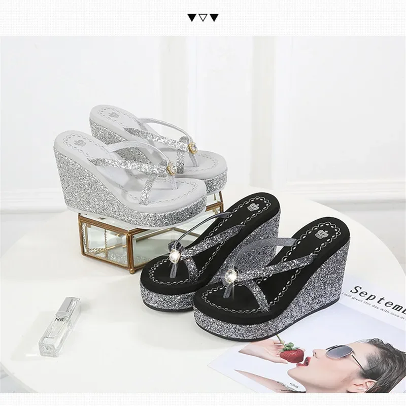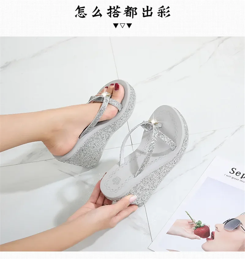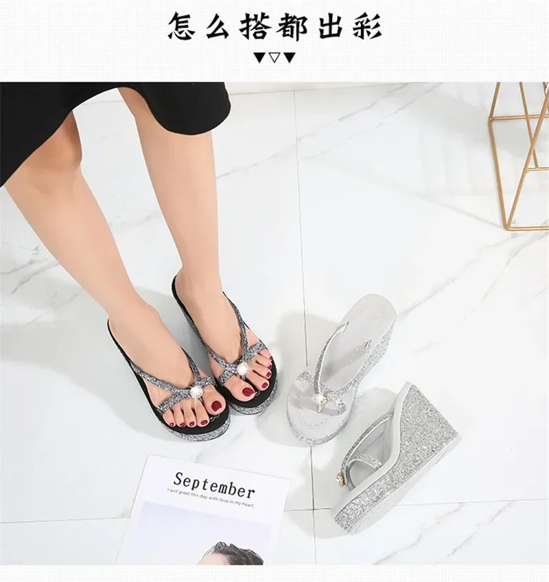 2025 Summer platform women shoes beach sandals rhinestones sequins slope with flip flops breathable shiny wedges