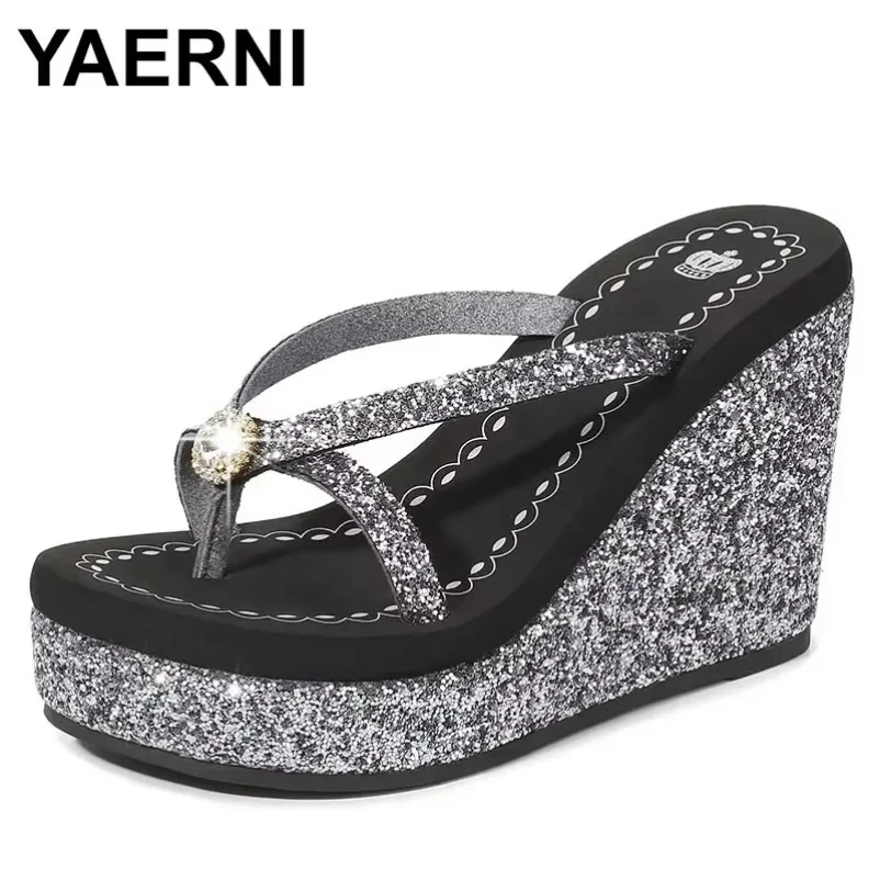 2025 Summer platform women shoes beach sandals rhinestones sequins slope with flip flops breathable shiny wedges