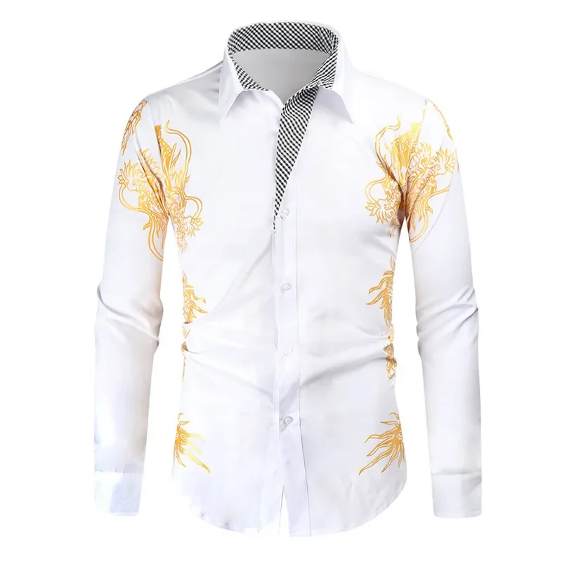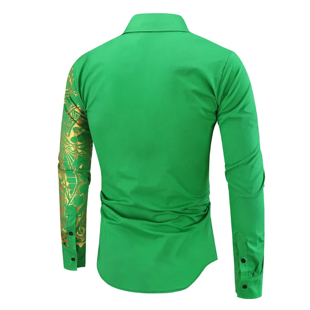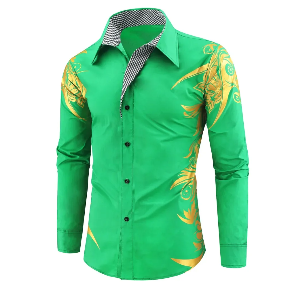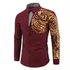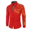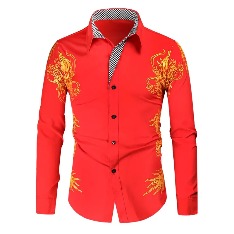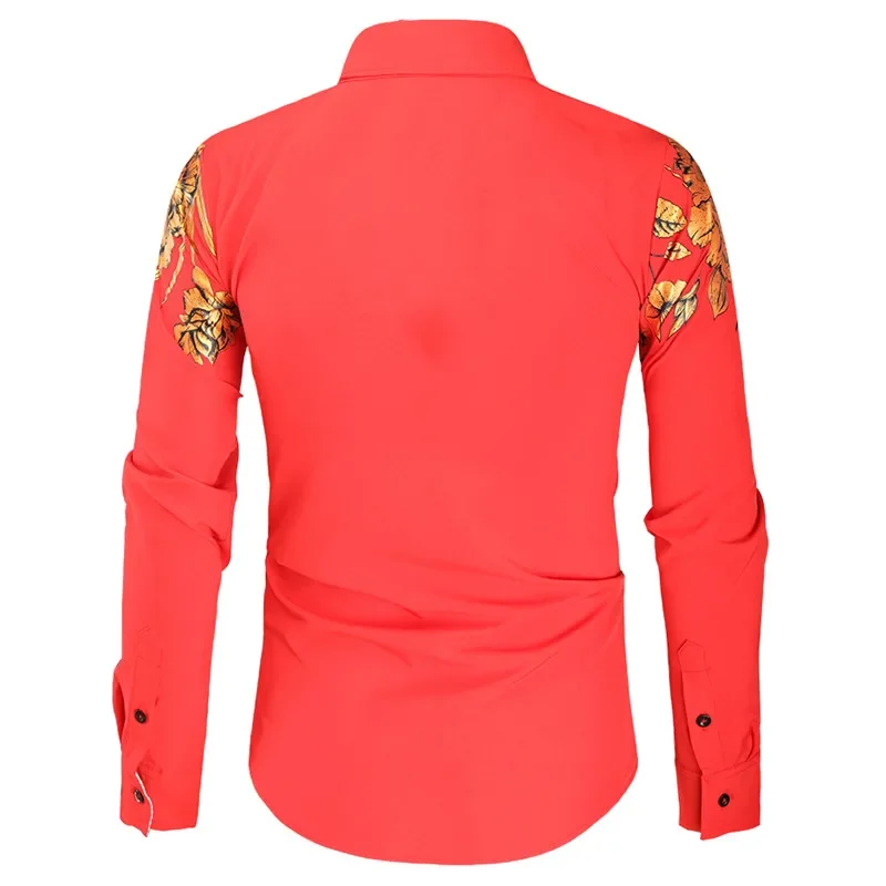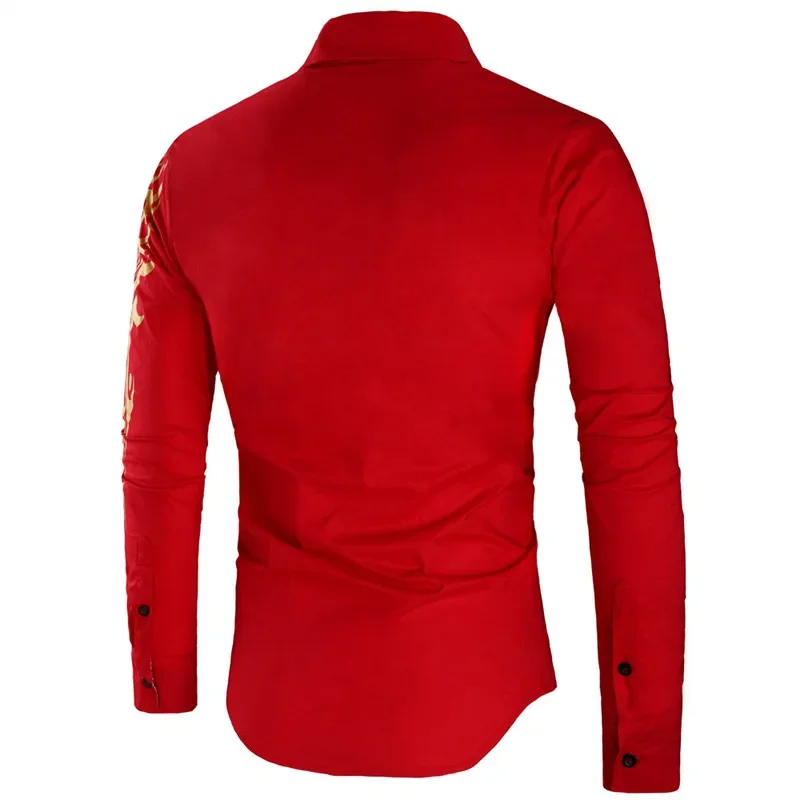 2026 Men’s Bright Red Long-sleeve Shirt, Single-button Lapel with Gold Print, Ideal for Weddings, Parties, or Stage Performances
