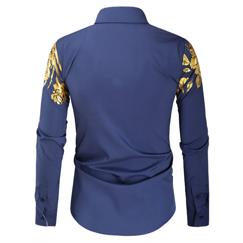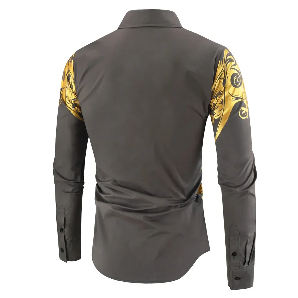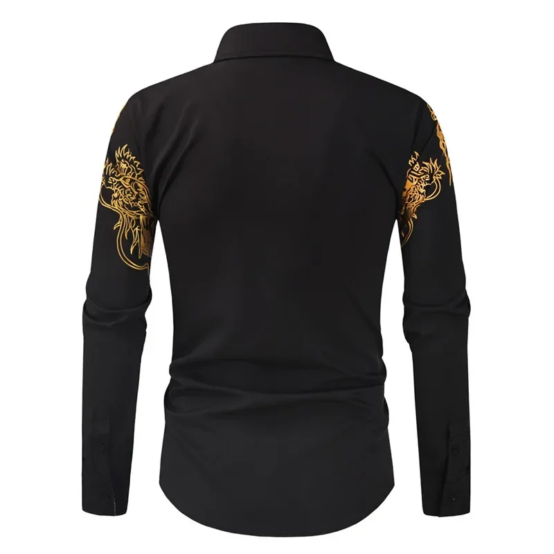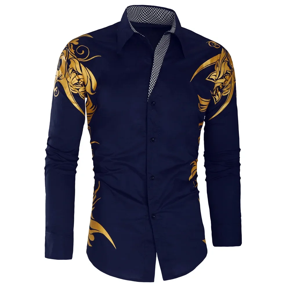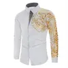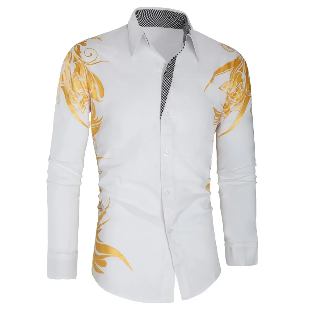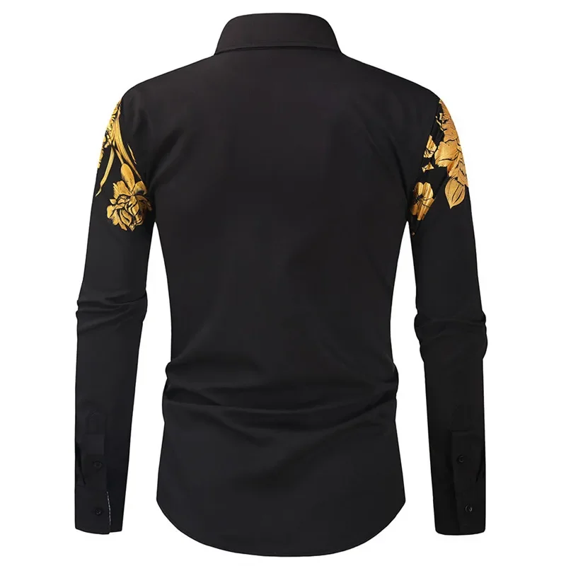 2026 Men’s Bright Red Long-sleeve Shirt, Single-button Lapel with Gold Print, Ideal for Weddings, Parties, or Stage Performances