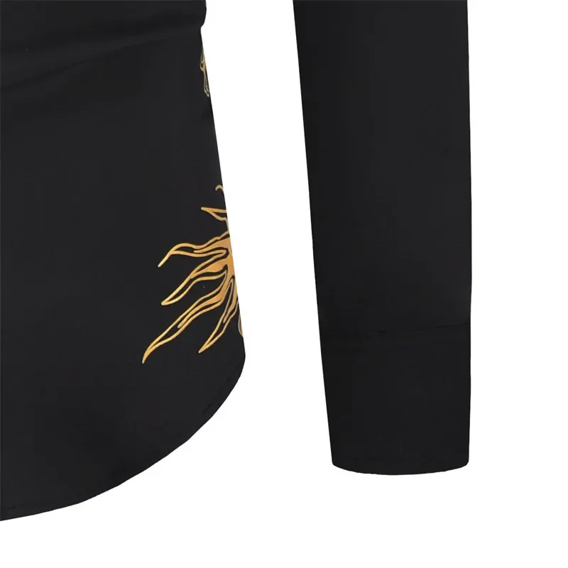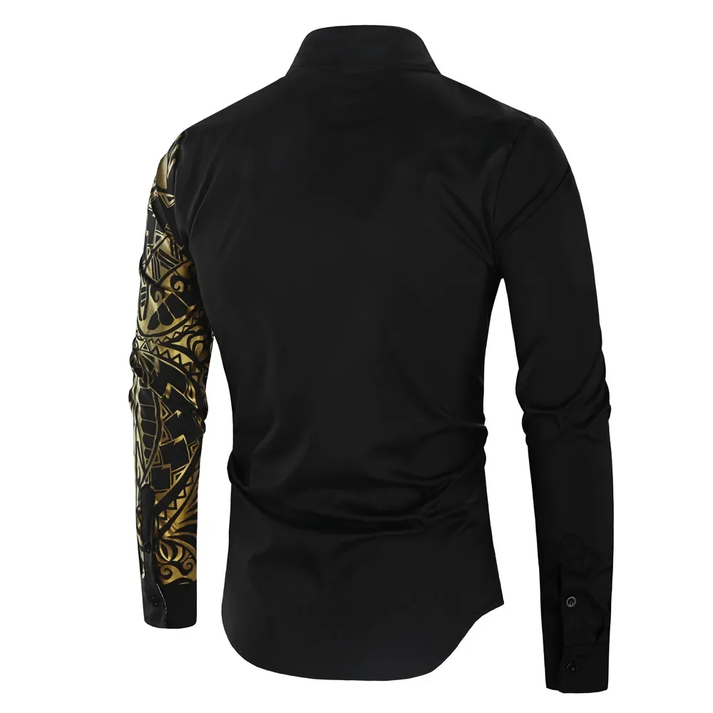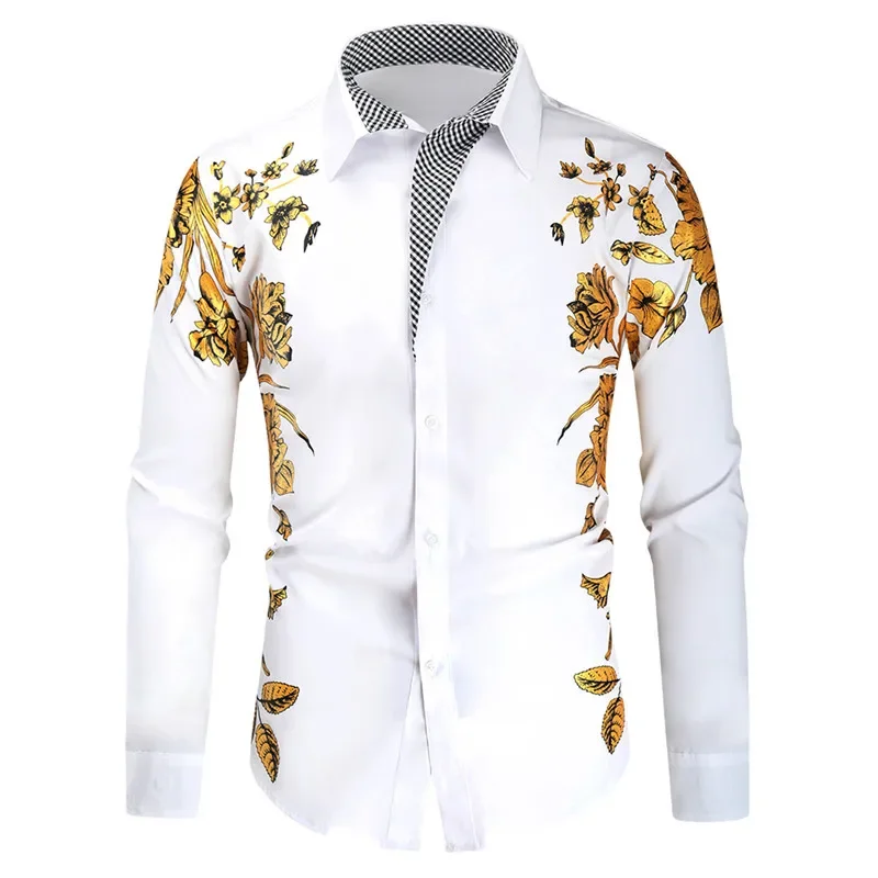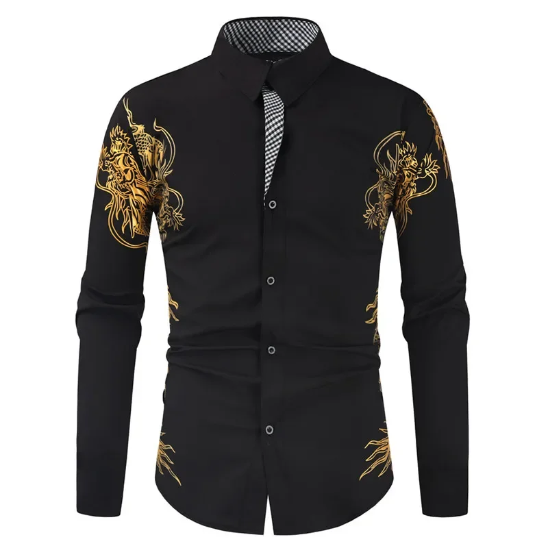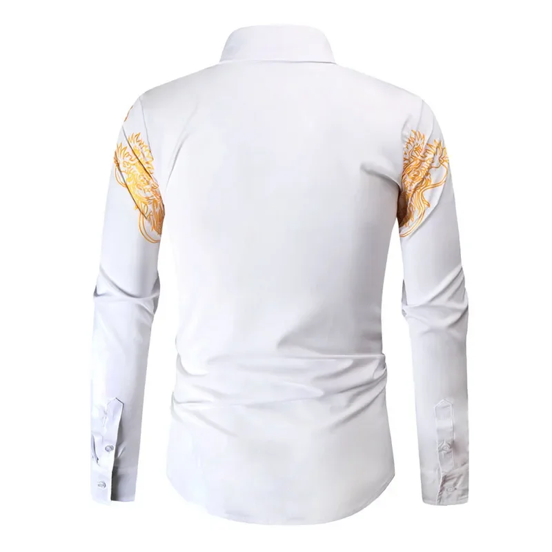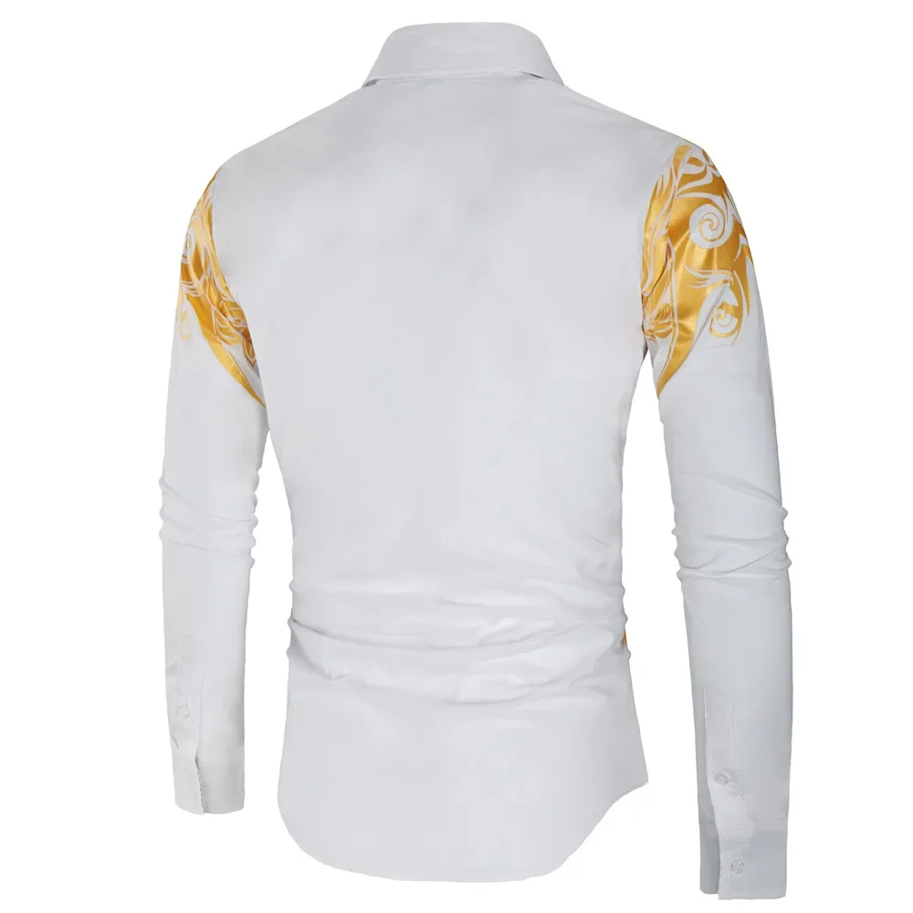2026 Men’s Bright Red Long-sleeve Shirt, Single-button Lapel with Gold Print, Ideal for Weddings, Parties, or Stage Performances