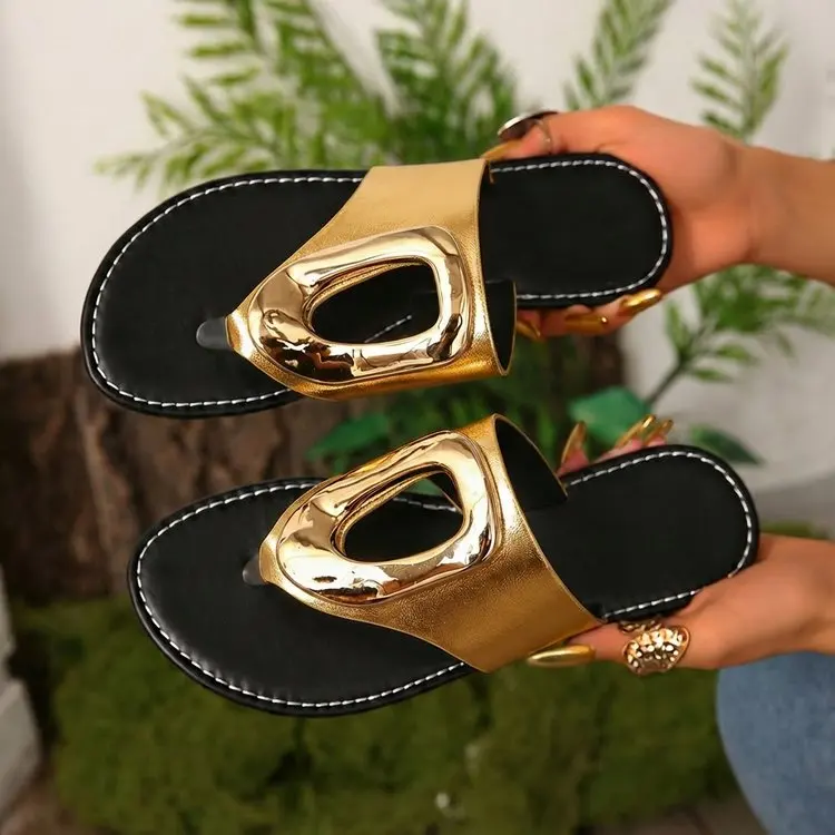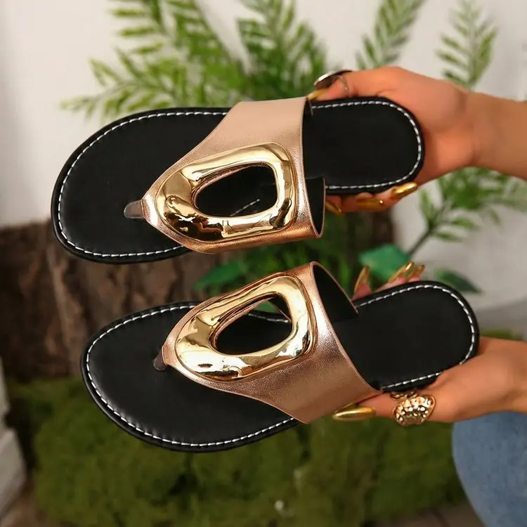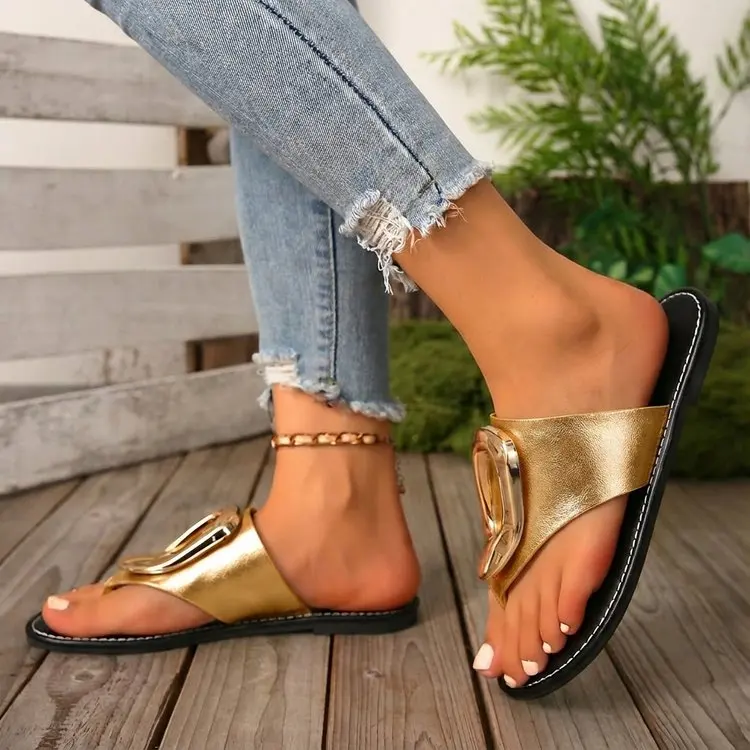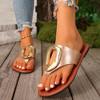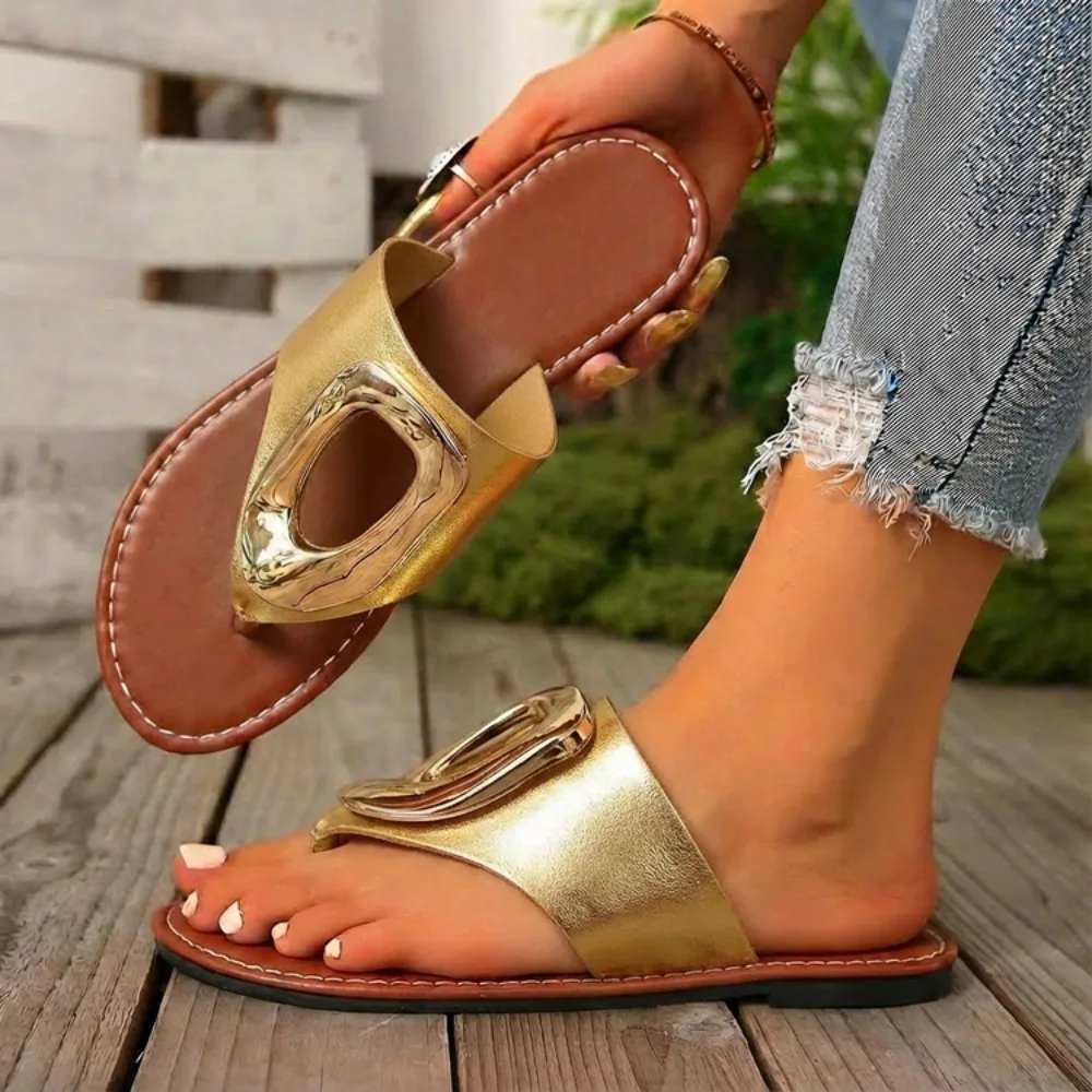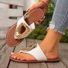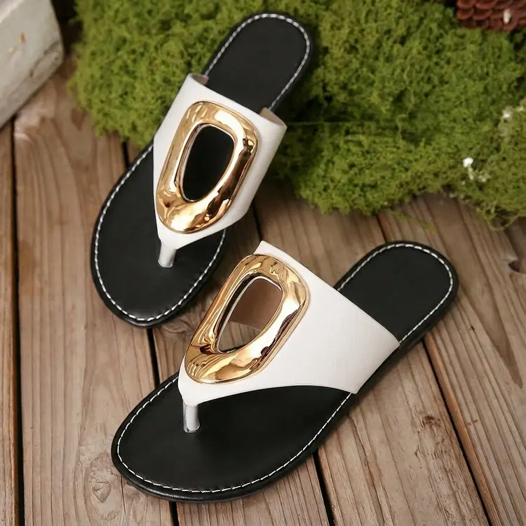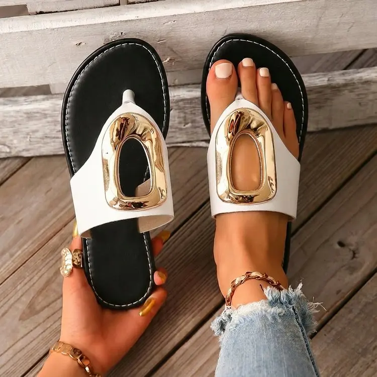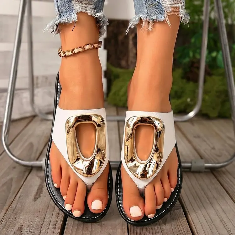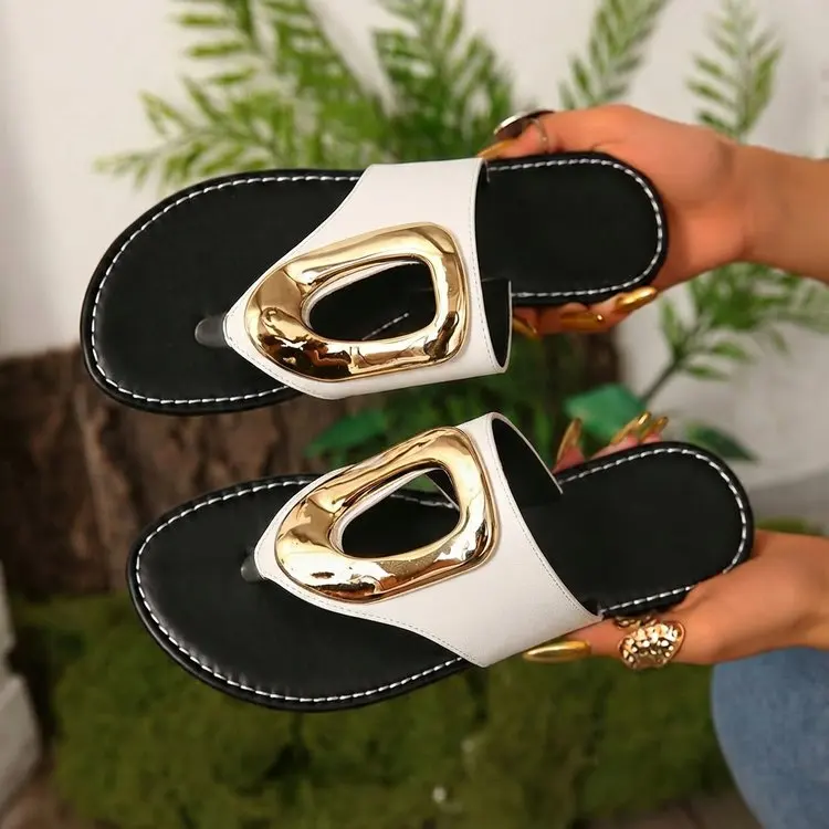 2026 Summer Women’s White Flip Flops Metal Buckle Decor Flat Sandals Comfortable Non-Slip Casual Beach Daily Shoes Soft Sole