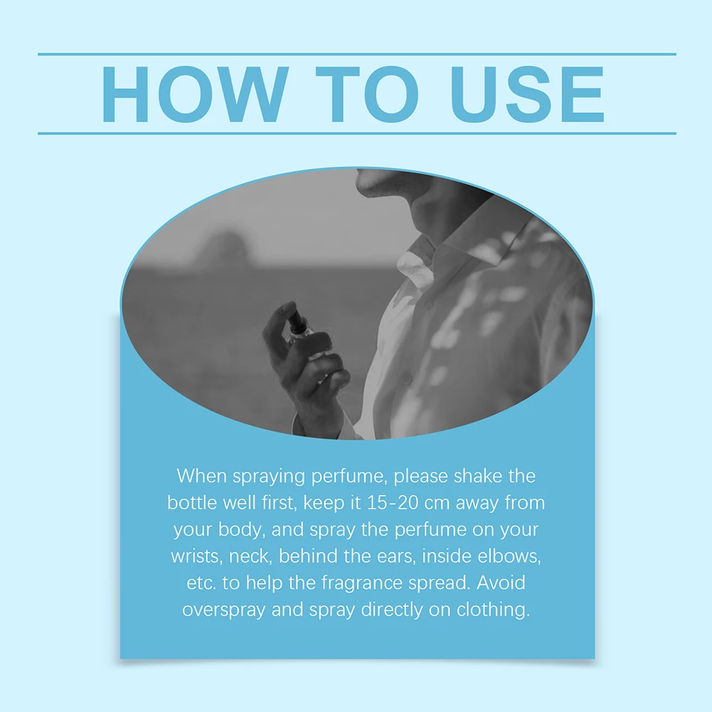 How to use When spraying perfume, please shake the bottle first, keep it 15-20 cm away from the body, and spray the perfume on the wrist, neck, behind the ears, inside the elbow, etc. to help the fragrance spread. Avoid excessive spraying and spraying directly on clothes. Storage conditions: Store in a dry place at room temperature.