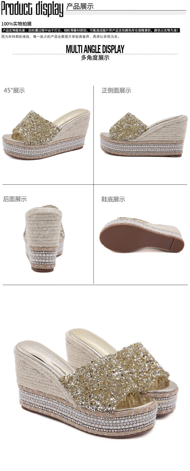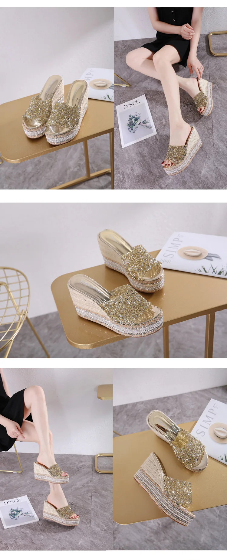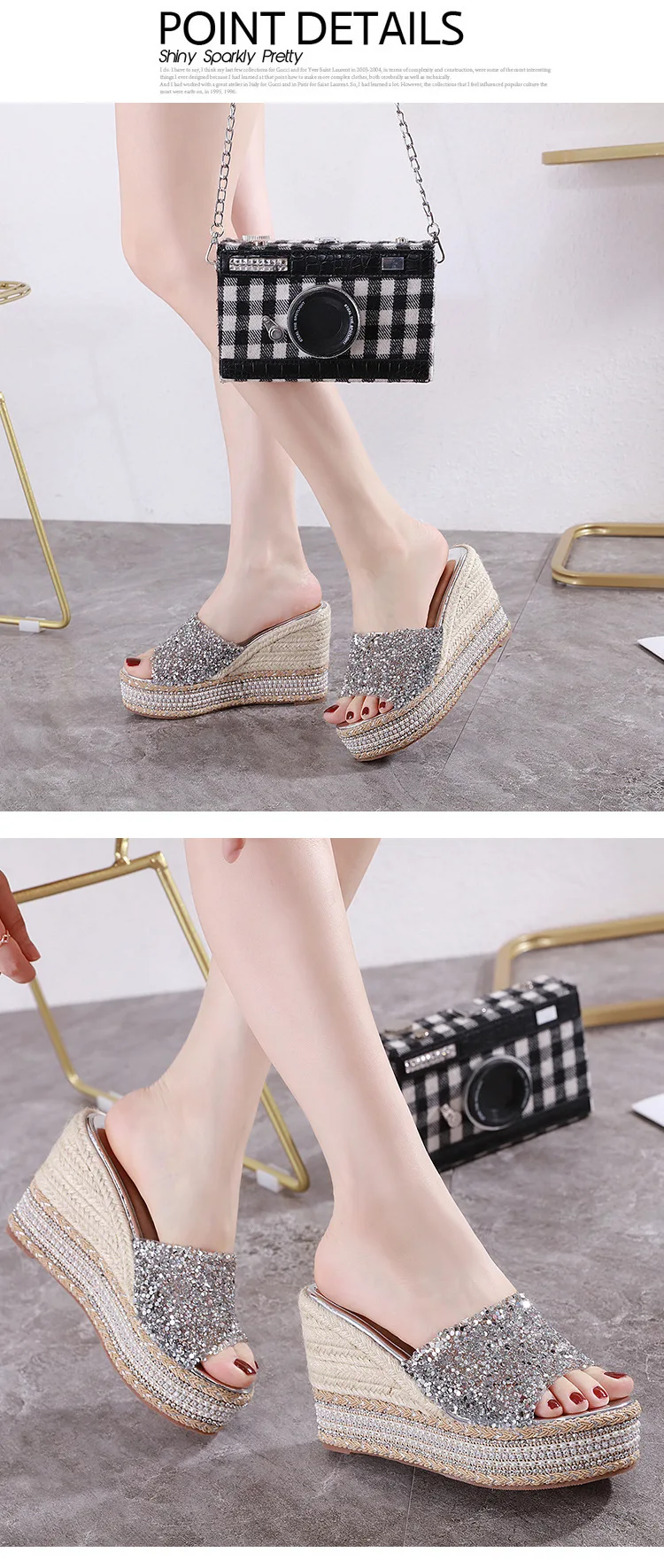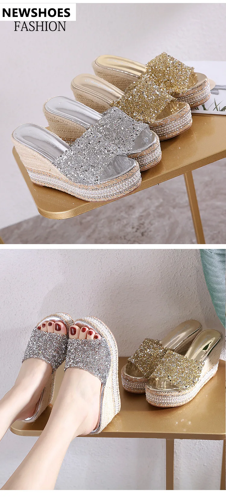 8-10cm Women’s Wedge Slippers Super High Heels Waterproof Platform Sequin Diamond Wedding Shoes Ladies Wear Outside Sandals