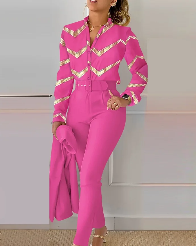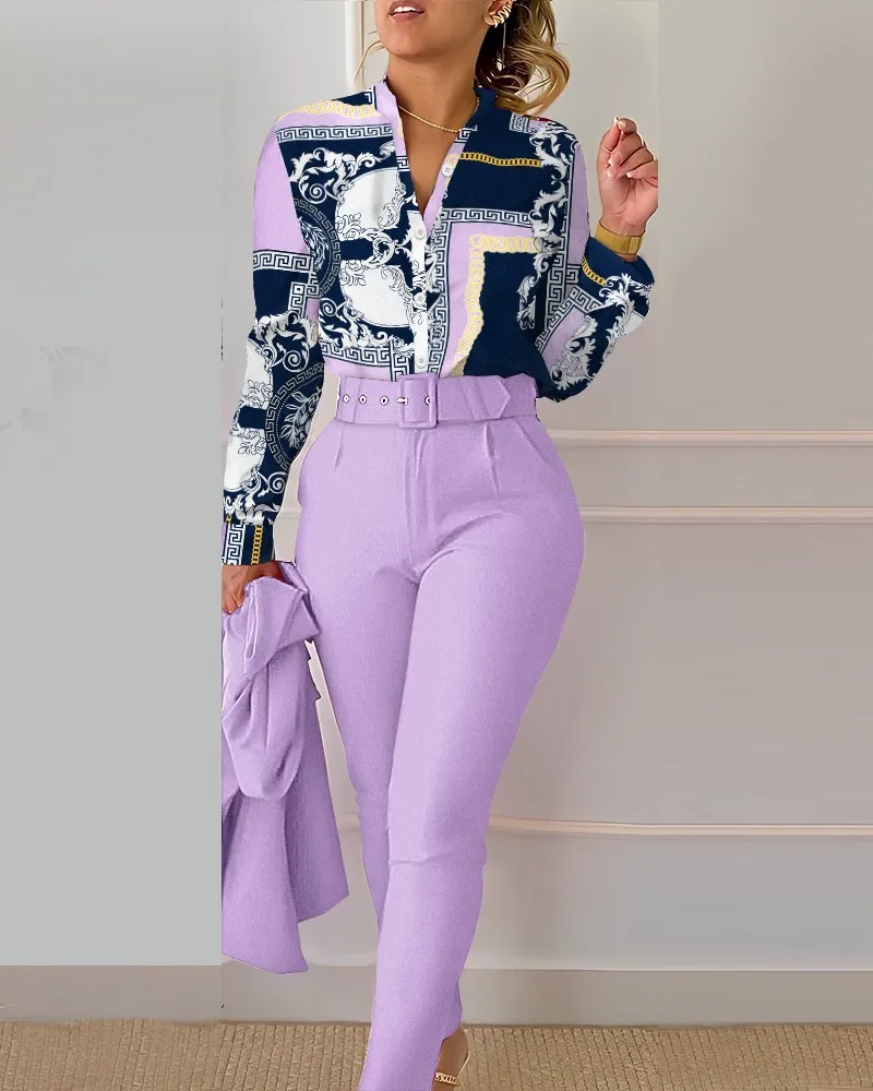 Autumn Winter Stand Neck Floral Print Long Sleeve Shirt Pants Two Piece Sets Elegant Women Casual Shirt Trousers Suits With Belt