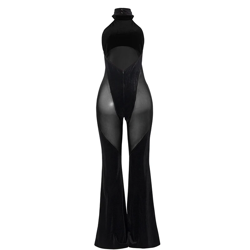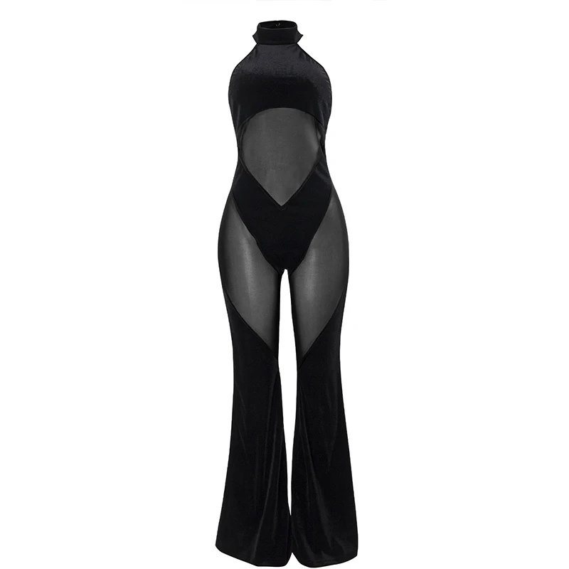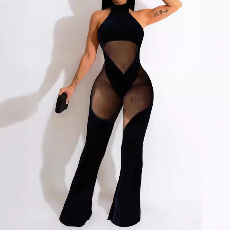 BKLD Women’s Hanging Neck Sexy Solid Color Sleeveless Skinny Fashion High Waist Mesh Splicing Casual Jumpsuits Nightclub Outfits