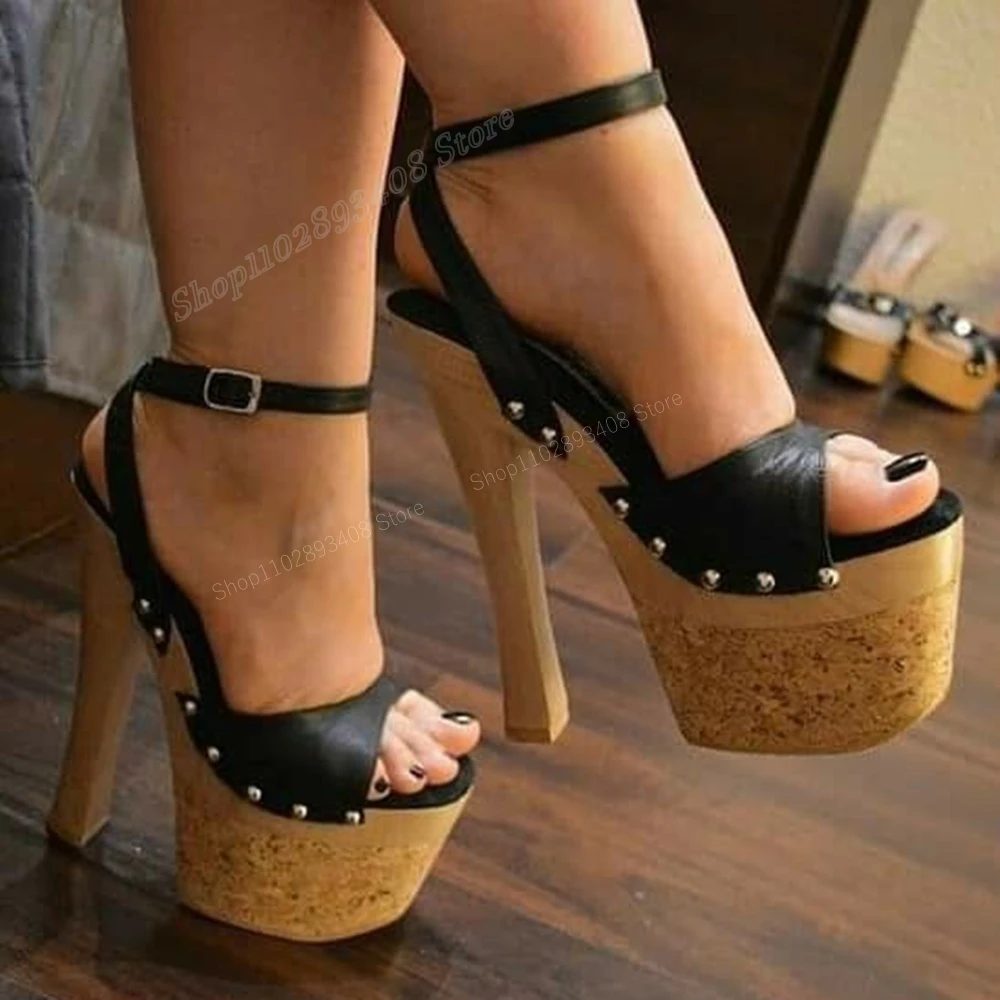 Black Platform Round Rivets Decor Sandals Chunky High Heel Ankle Buckle Fashion Sexy Women Shoes 2024 Summer Zapatos Para Mujere