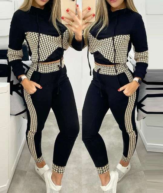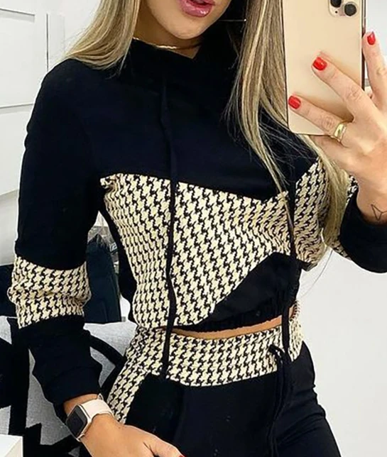 Black Thousand Bird Grid Printed Casual Set for Women’s Fashion and Leisure, Autumn/Winter 2025 New Collection