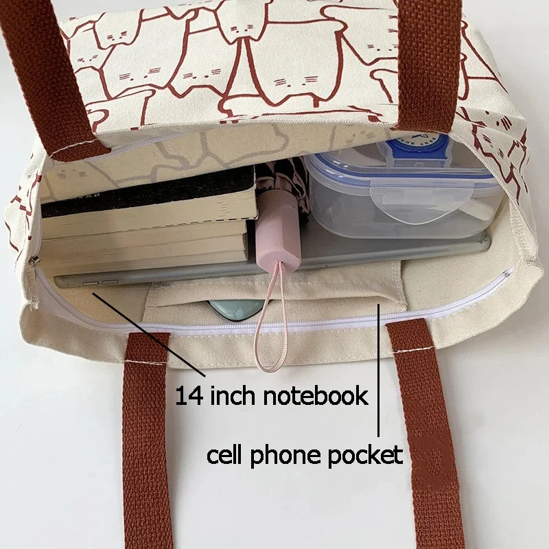 Canvas Bags Handbag for Women Shopper Cute Cat Tote Bag with Zipper Designer Bag Japanese Style Cartoon Small Shoulder