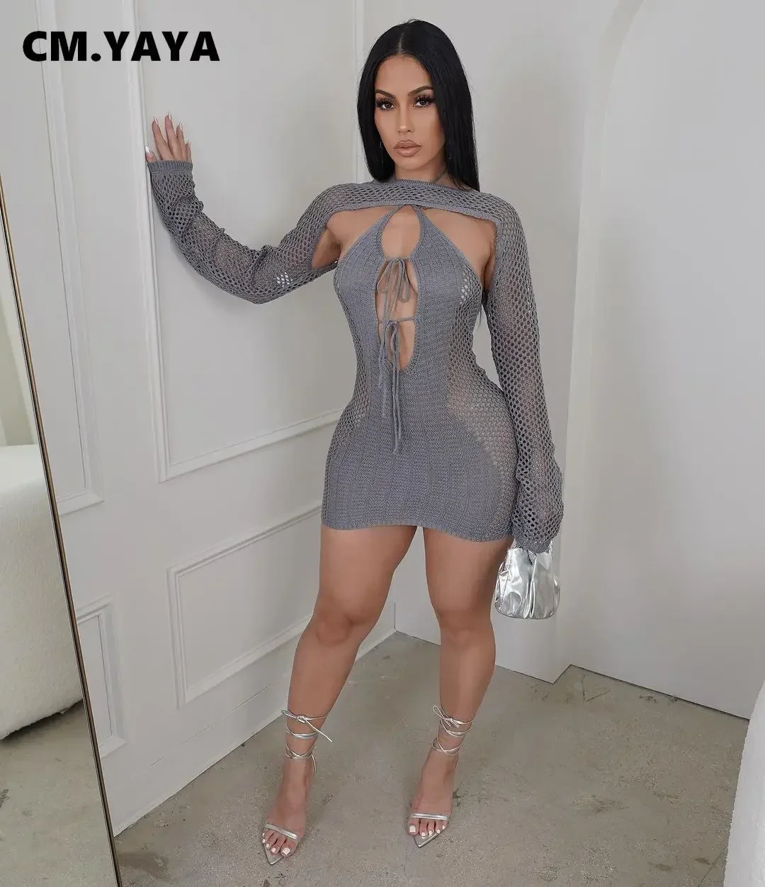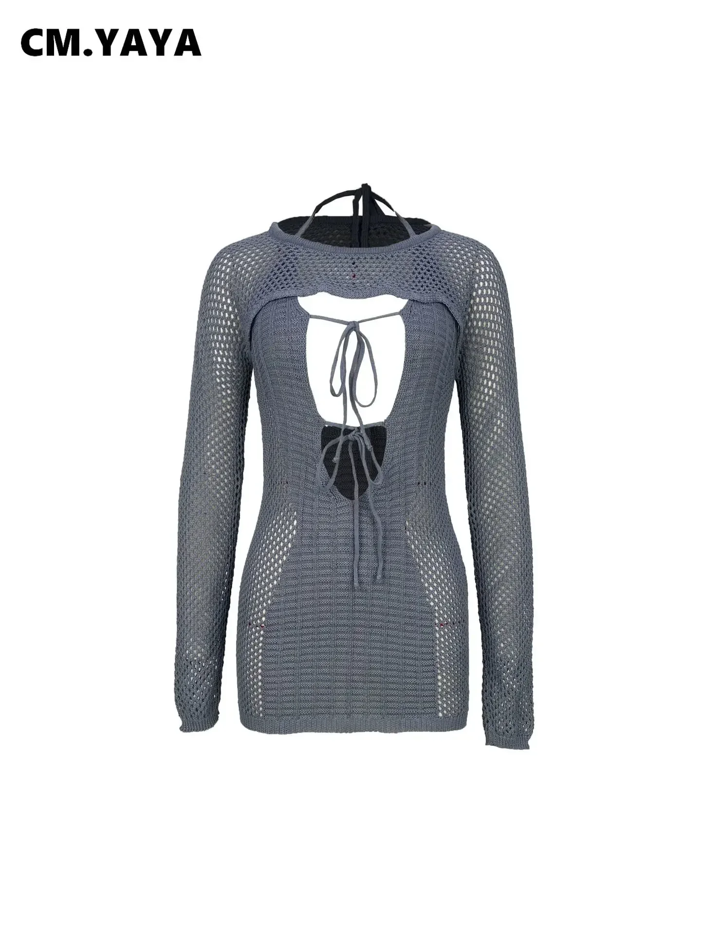 CM.YAYA Crochet Birthday Bodycon Midi Halter Neck Tie Up Dress Women 2023 Dresses with Cover-ups Two 2 Piece Sets Vestidos