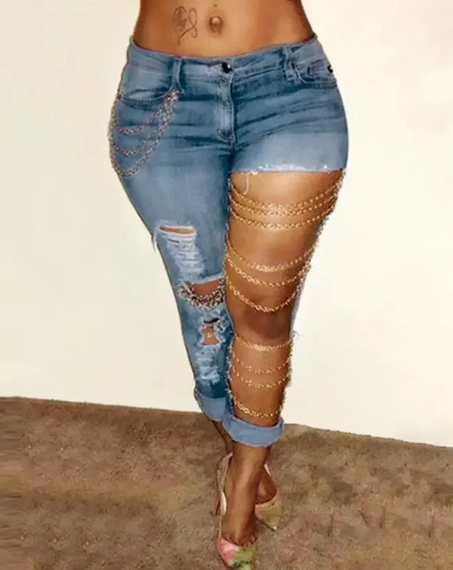 Women’s Jeans 2024 Spring Fashion Chain Decor Cutout Ripped Casual Skinny Daily Long Denim Pants Y2K Streetwear