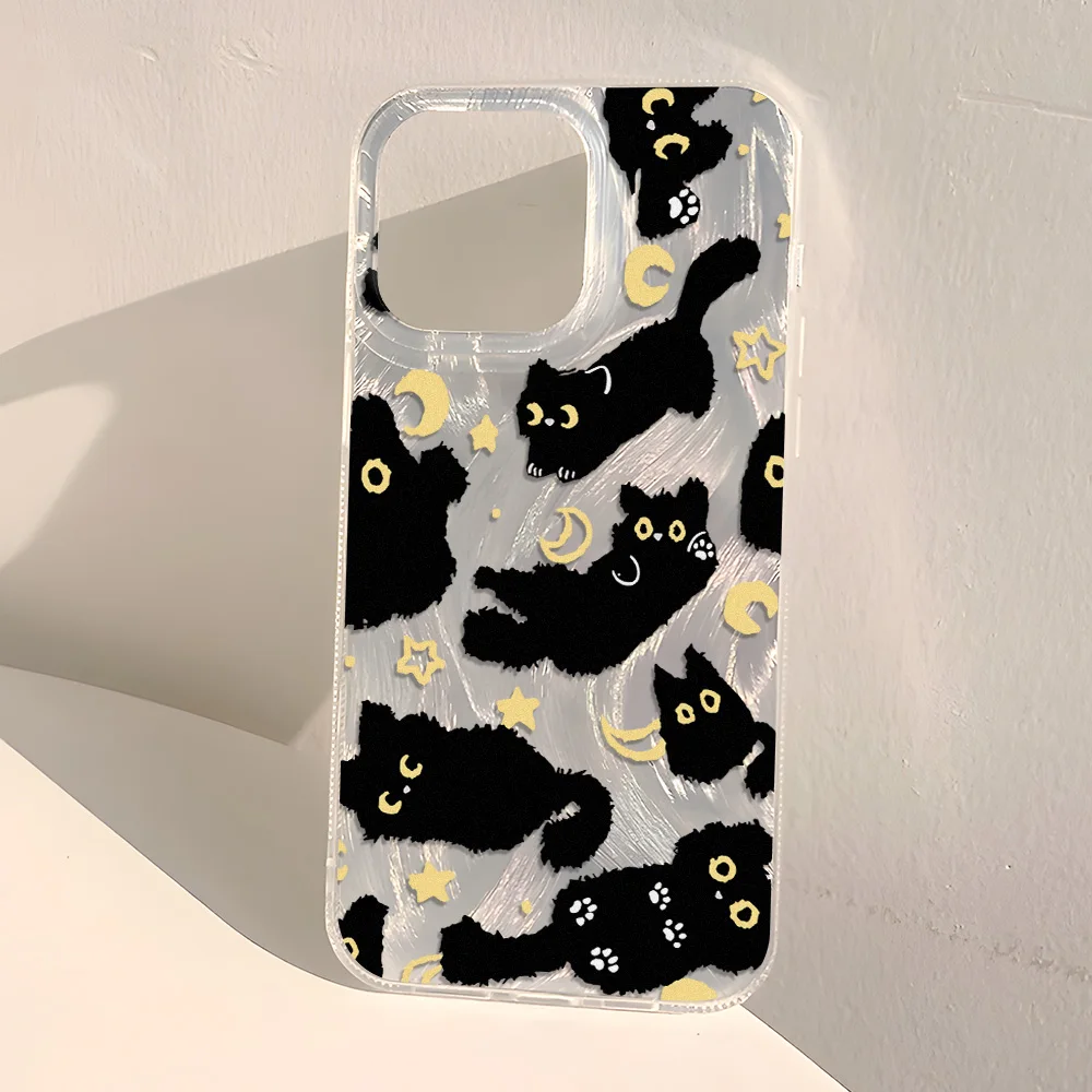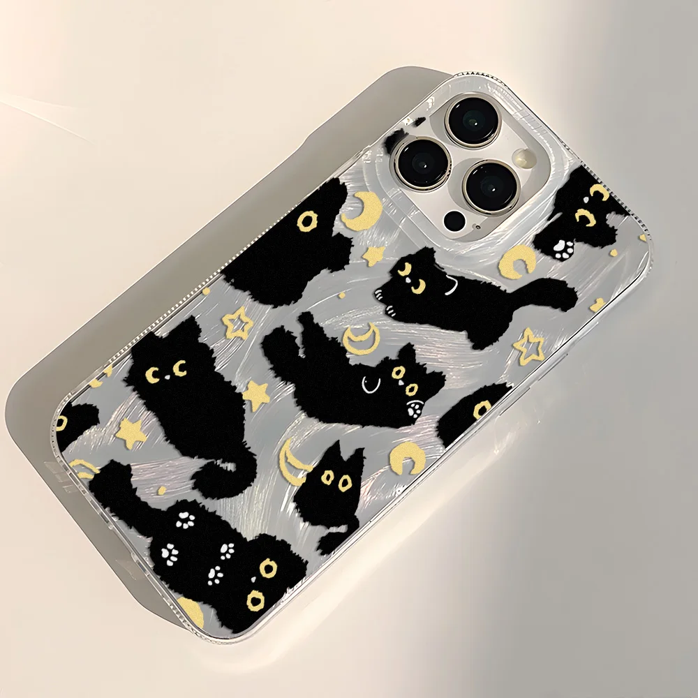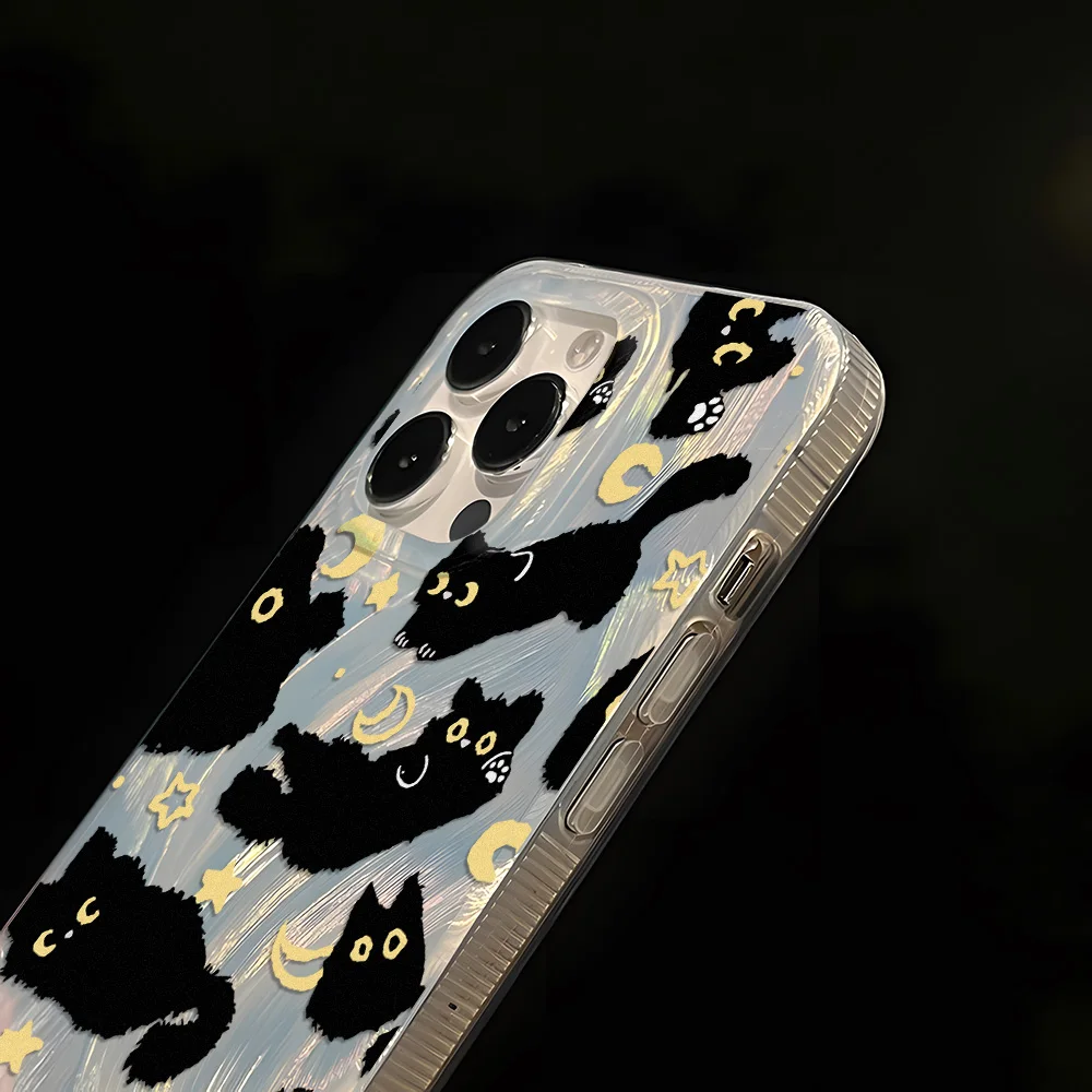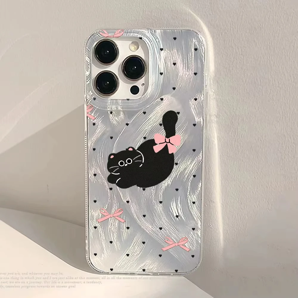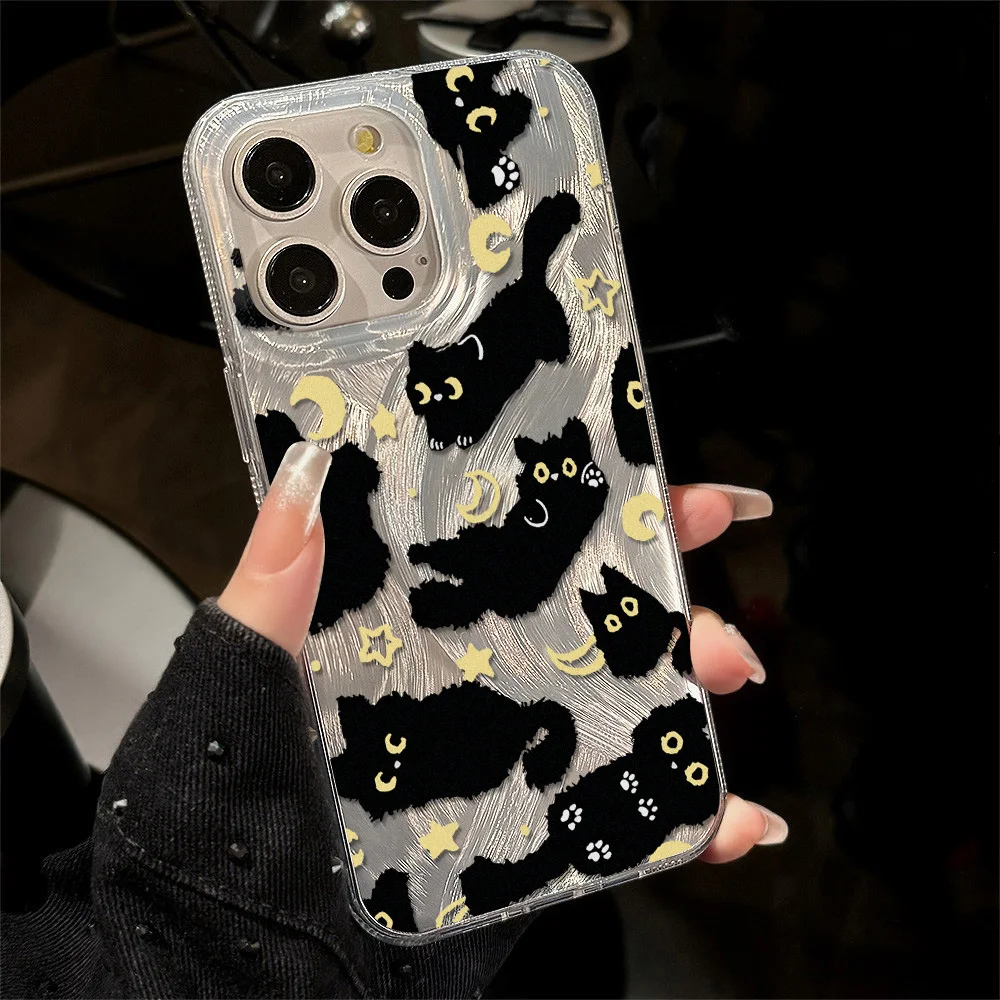 Cute Black Cat Phone Case For iPhone 13 Case iPhone 16 15 11 12 14 Pro Max Plus Laser Silver Feather Texture Shockproof Cover