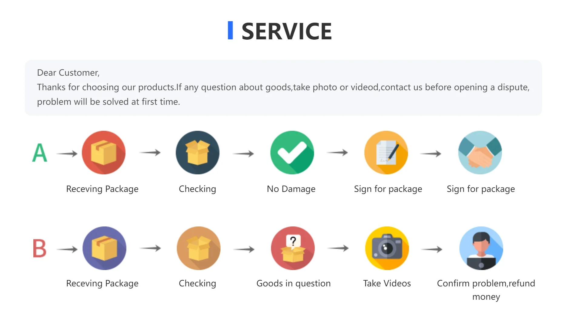 • If you received the wrong item you can request a refund or a reshipment.
