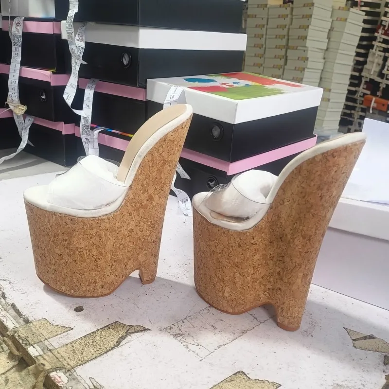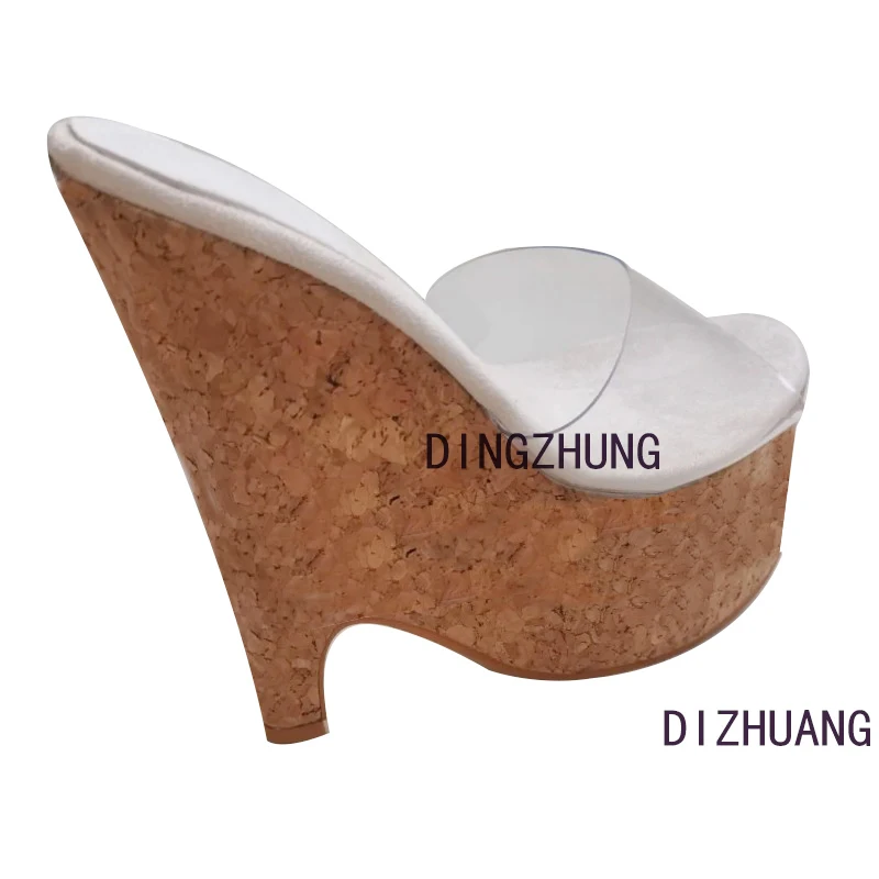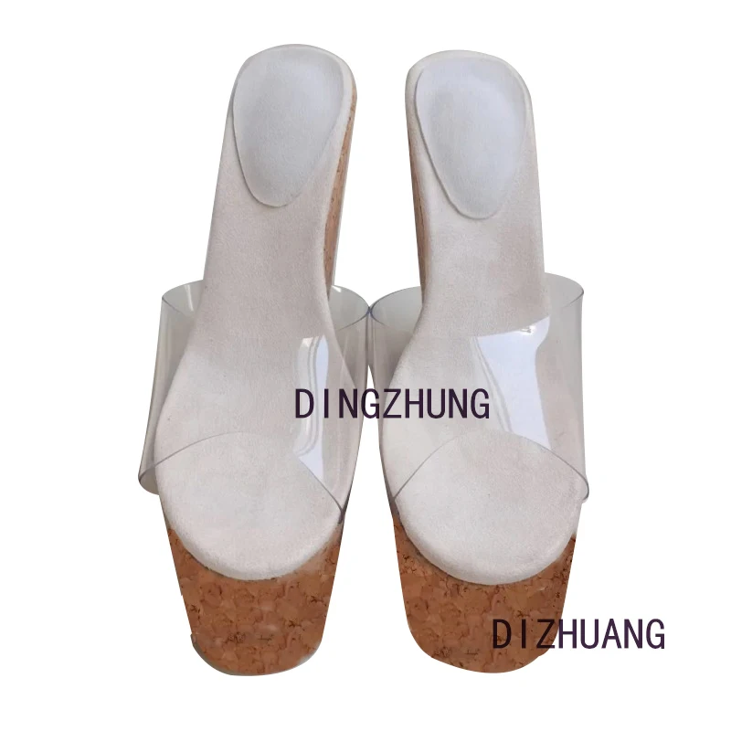 Sexy women’s high-heeled slippers. Transparent PVC slippers. 18-20cm heel height. Cork patterned wedges platform slippers. Summer shoes. Fashion show casual shoes. SIZE:34-46