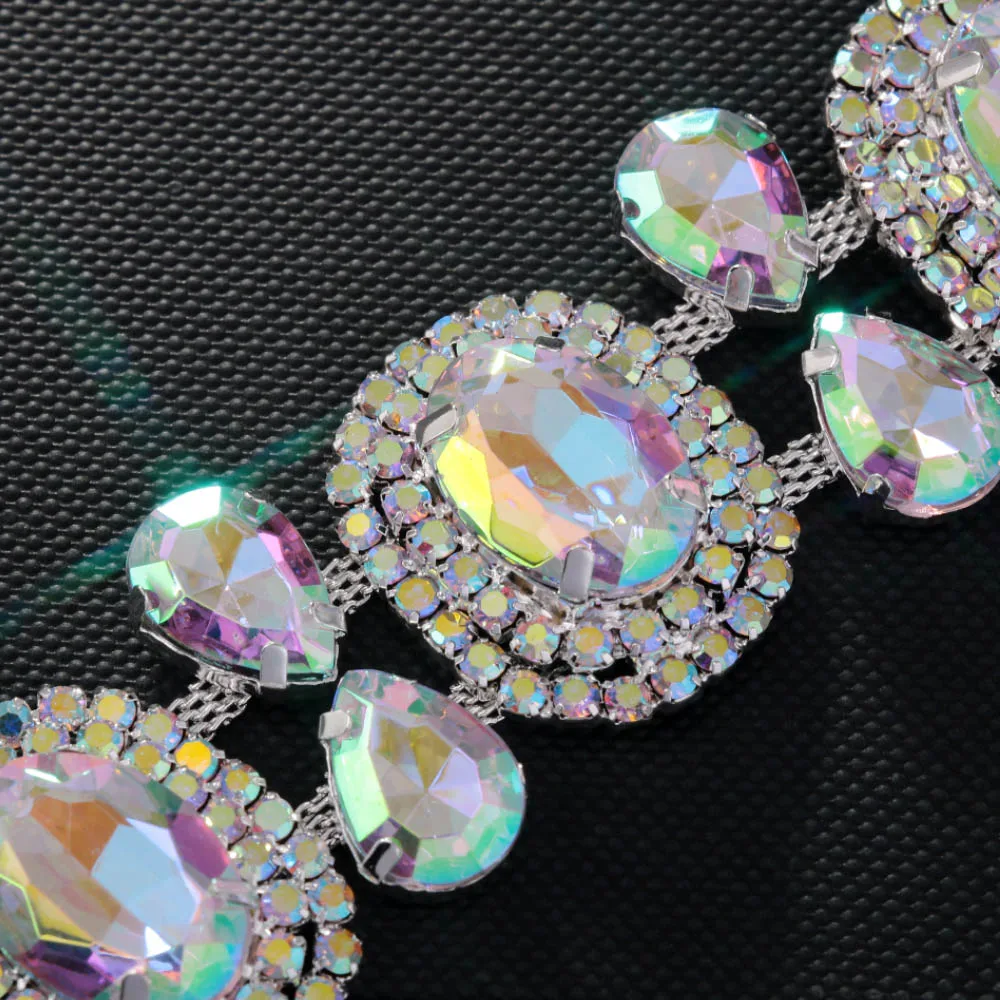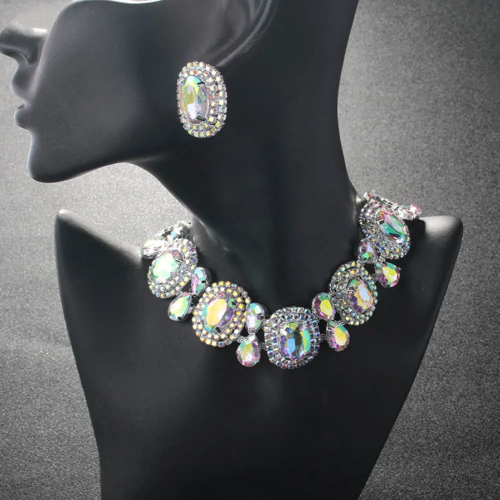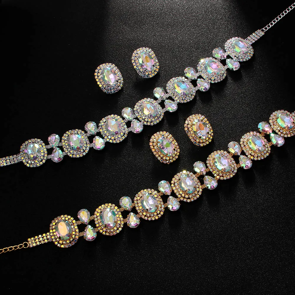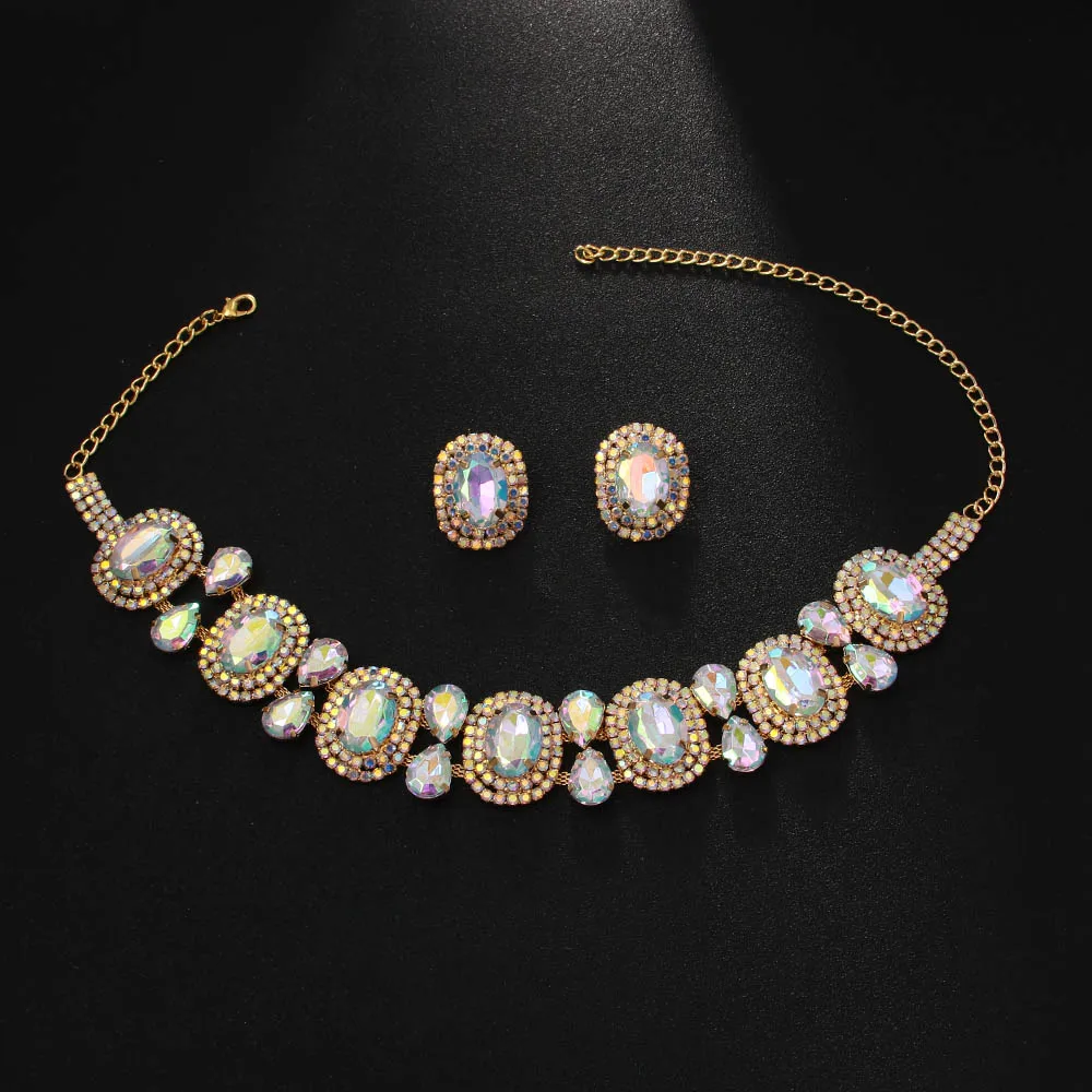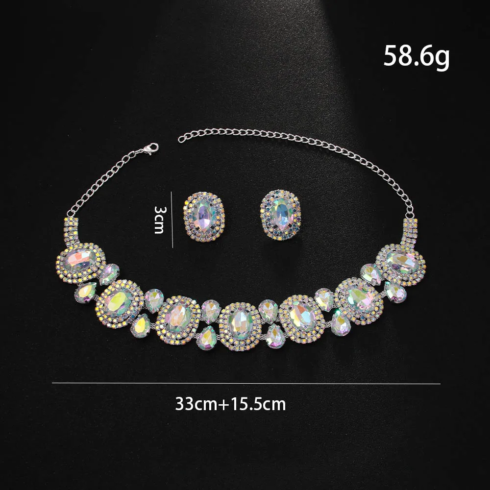 Elegant Boho Round Crystal Jewelry Set Piercing Wedding Gift for Bridal Bling Geometric Rhinestone Necklace Earring Set Party