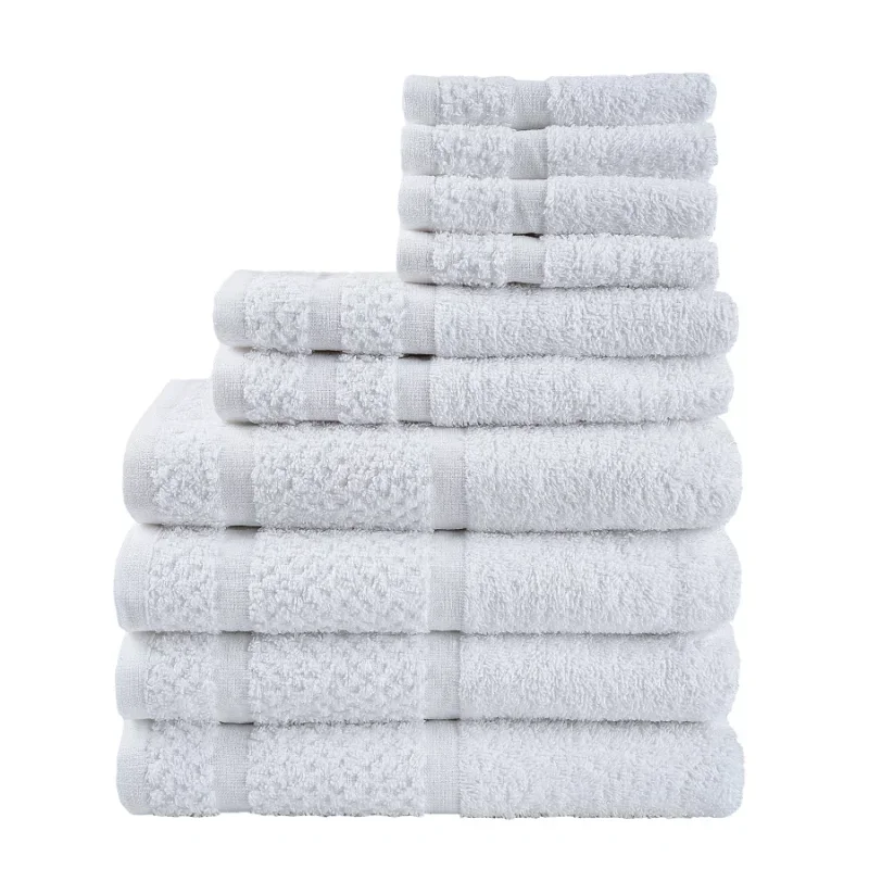 Embrace yourself in the comfort of  Value 10-Piece Towel Set. Made from soft, absorbent 100% cotton, these towels dry quickly . The new design features a popcorn textured border for a fresh look in your bathroom, and double needle stitching for durability. This fade-resistant set includes four bath towels, two hand towels, and 4 washcloths, All age group. and all machine washable..