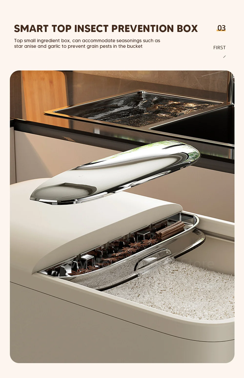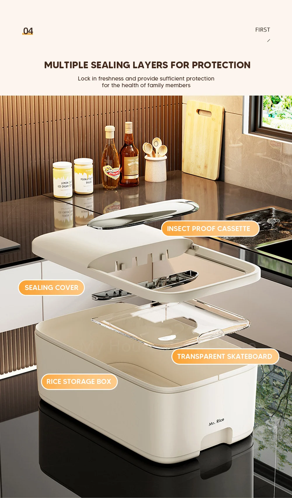 This storage box is equipped with an extended insect proof box, which effectively prevents insect infestation and moisture intrusion, keeping the rice dry and fresh.