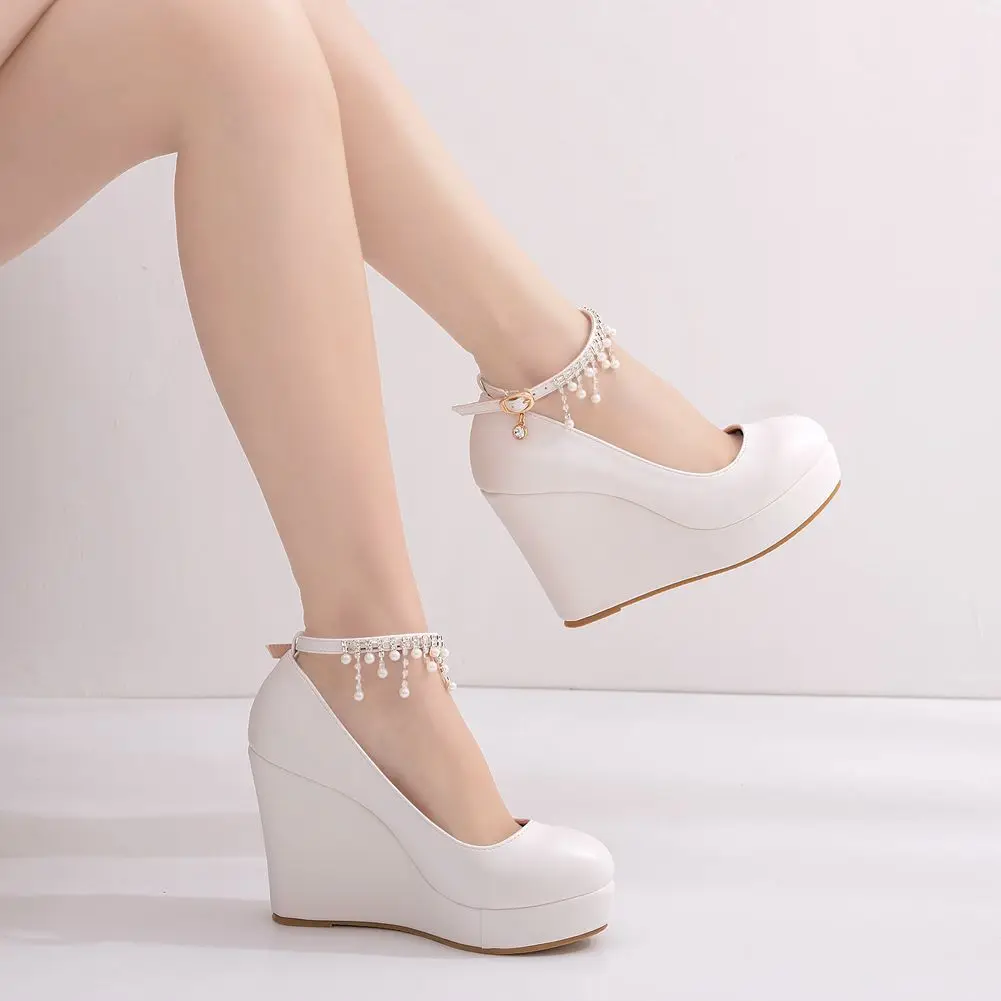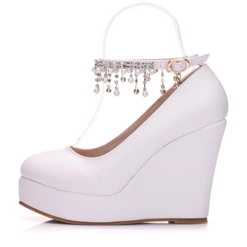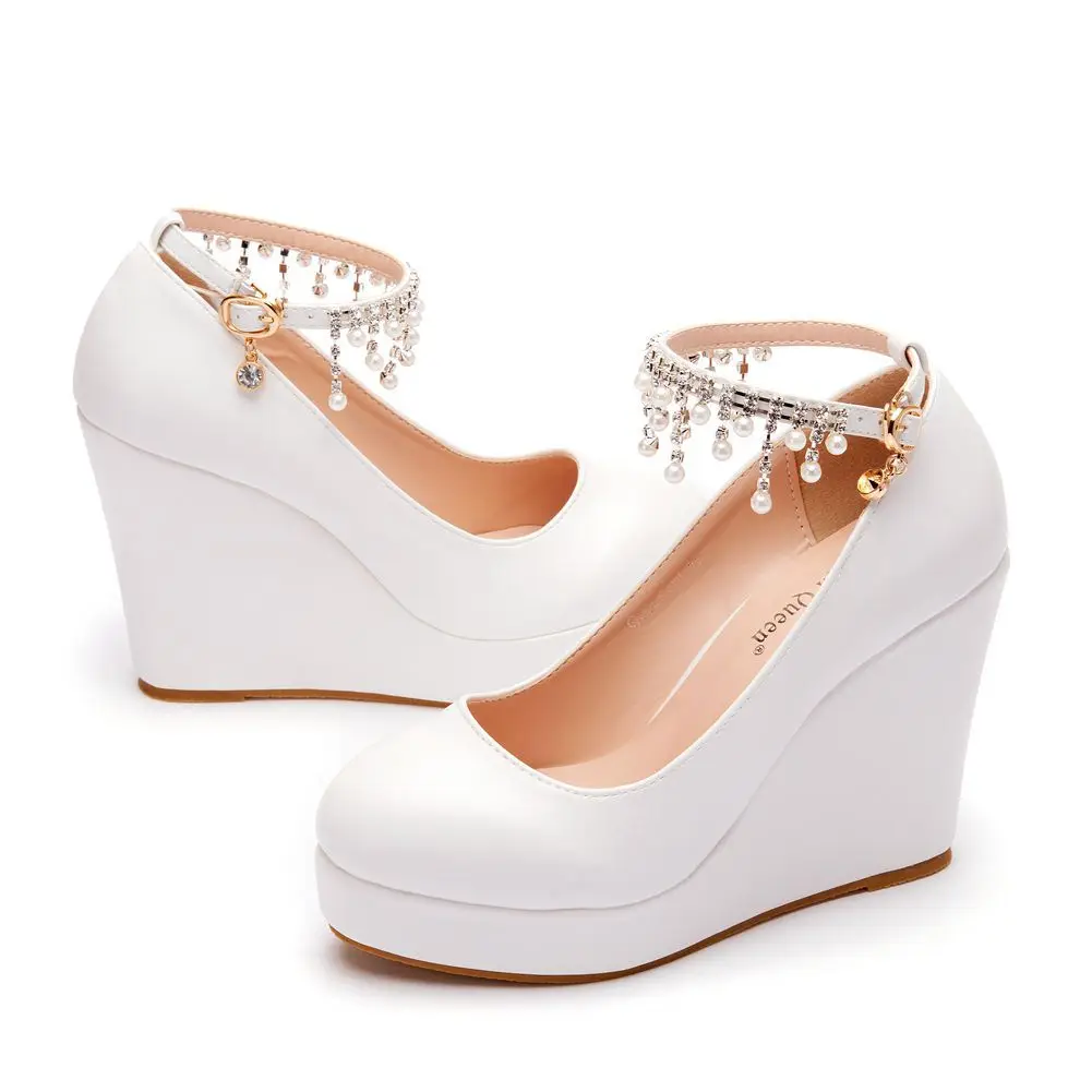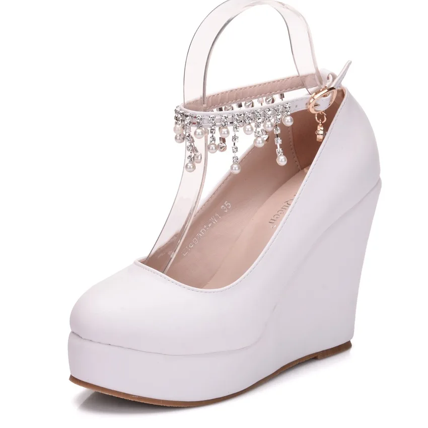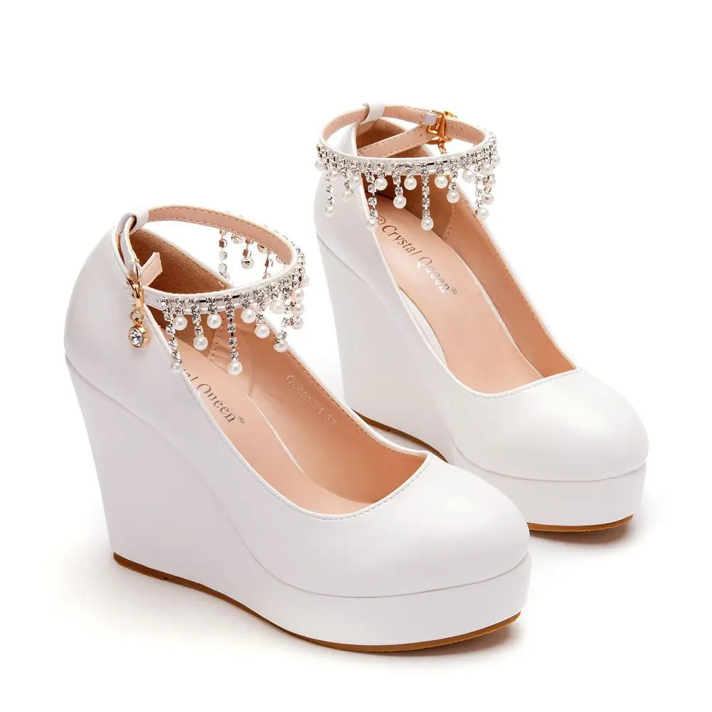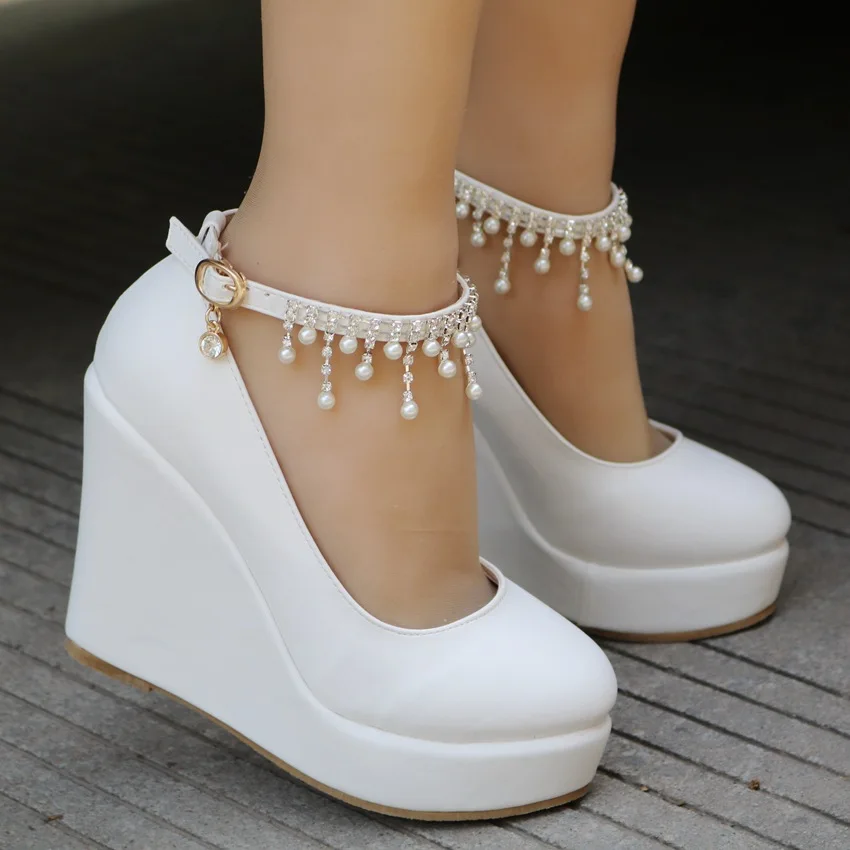 11cm White Round Head Wedges Platform Shoes Women Tassel Flowing High Heel Shoes Plus Size for Wedding Party Chaussure Femme