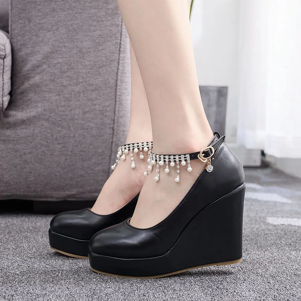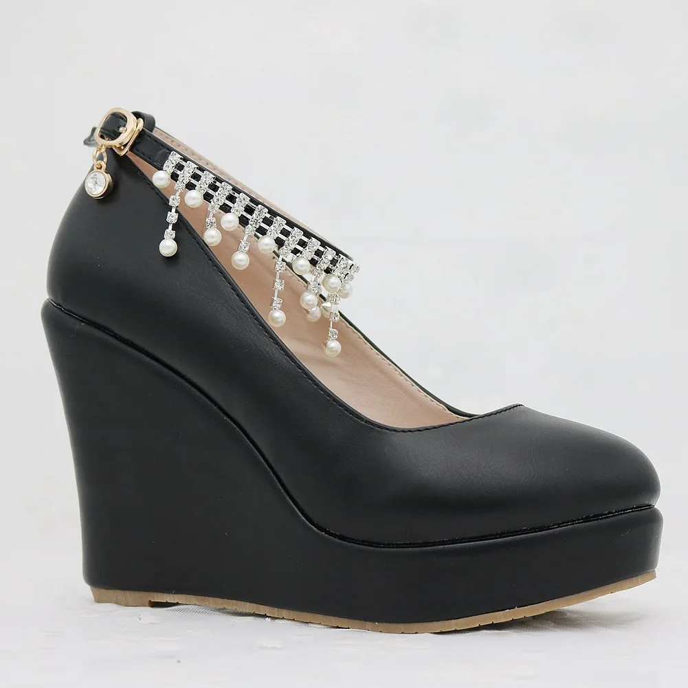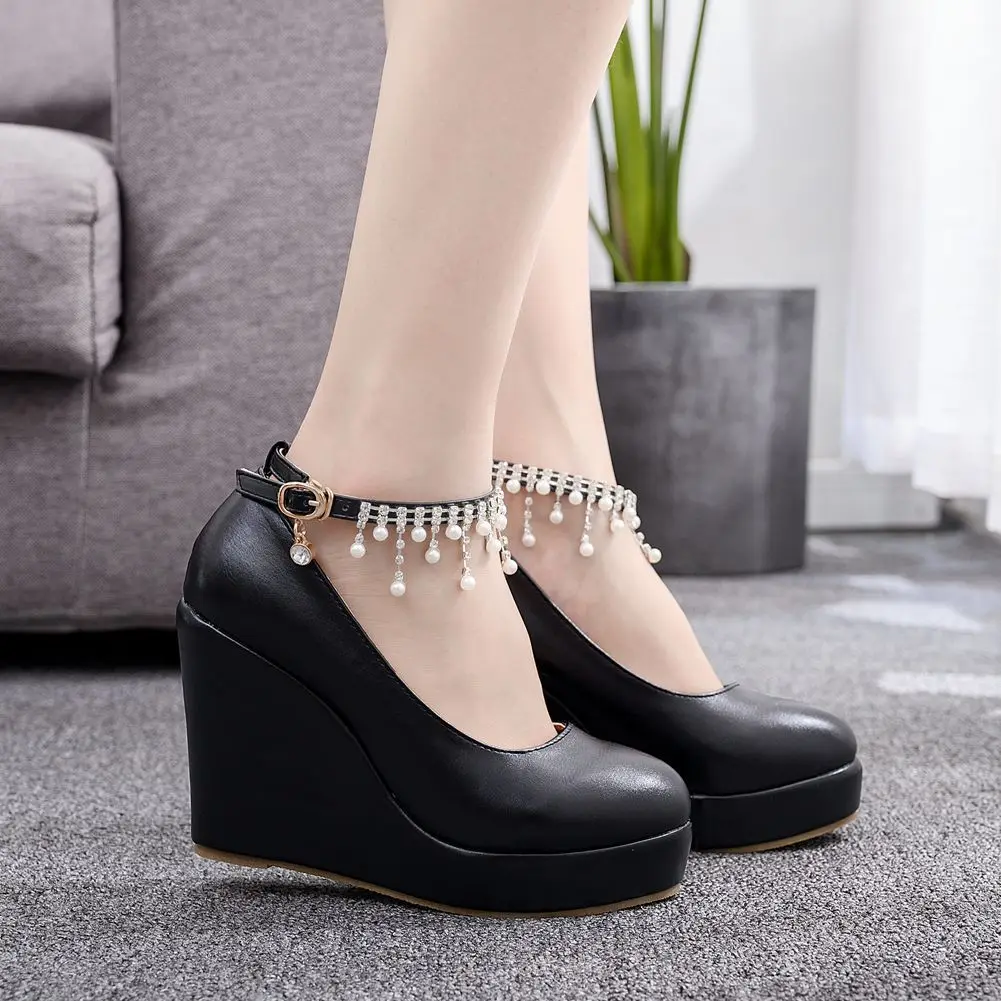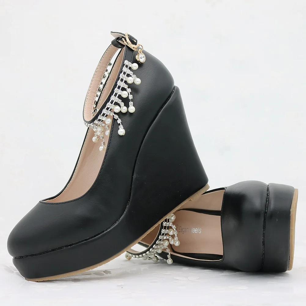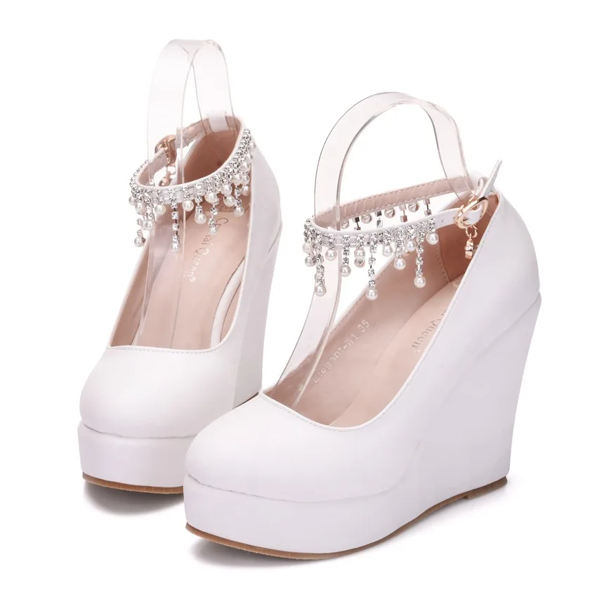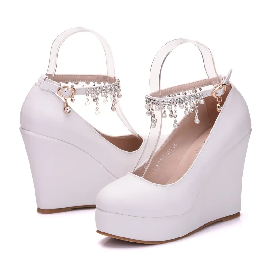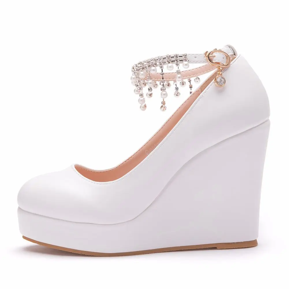 11cm White Round Head Wedges Platform Shoes Women Tassel Flowing High Heel Shoes Plus Size for Wedding Party Chaussure Femme