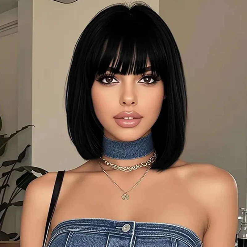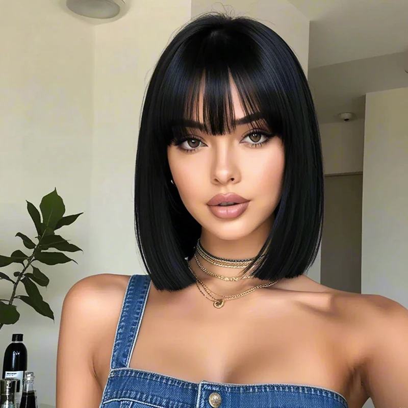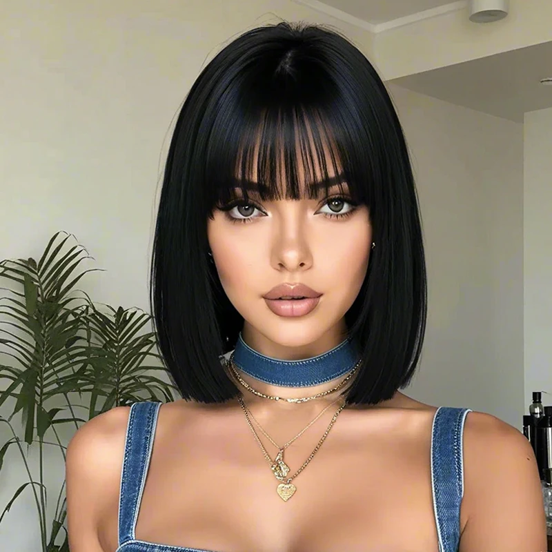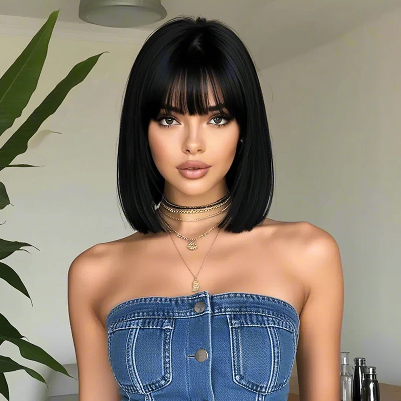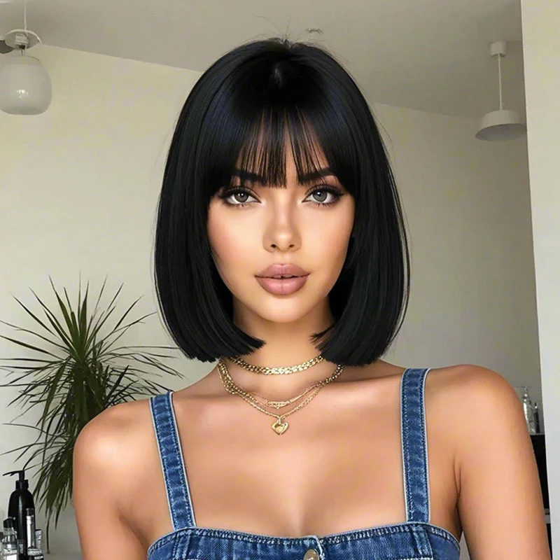 12 inch black air bangs Bob wig,high-temperature synthetic straight hair wig,elegant style,suitable for all women’s daily wear.