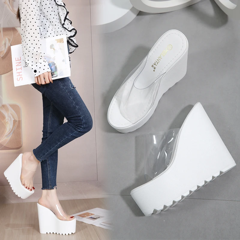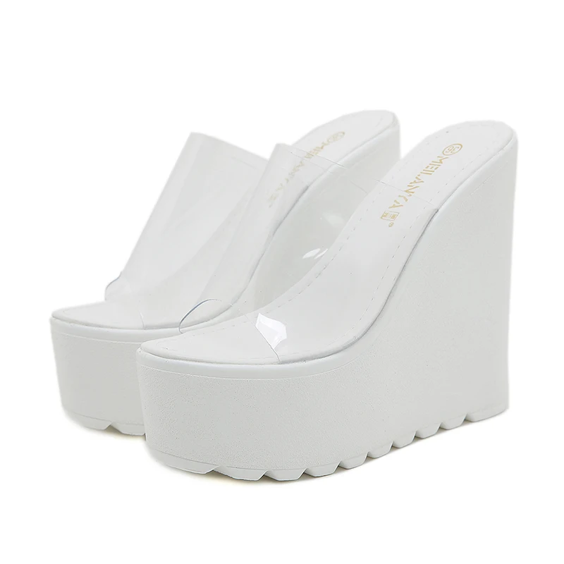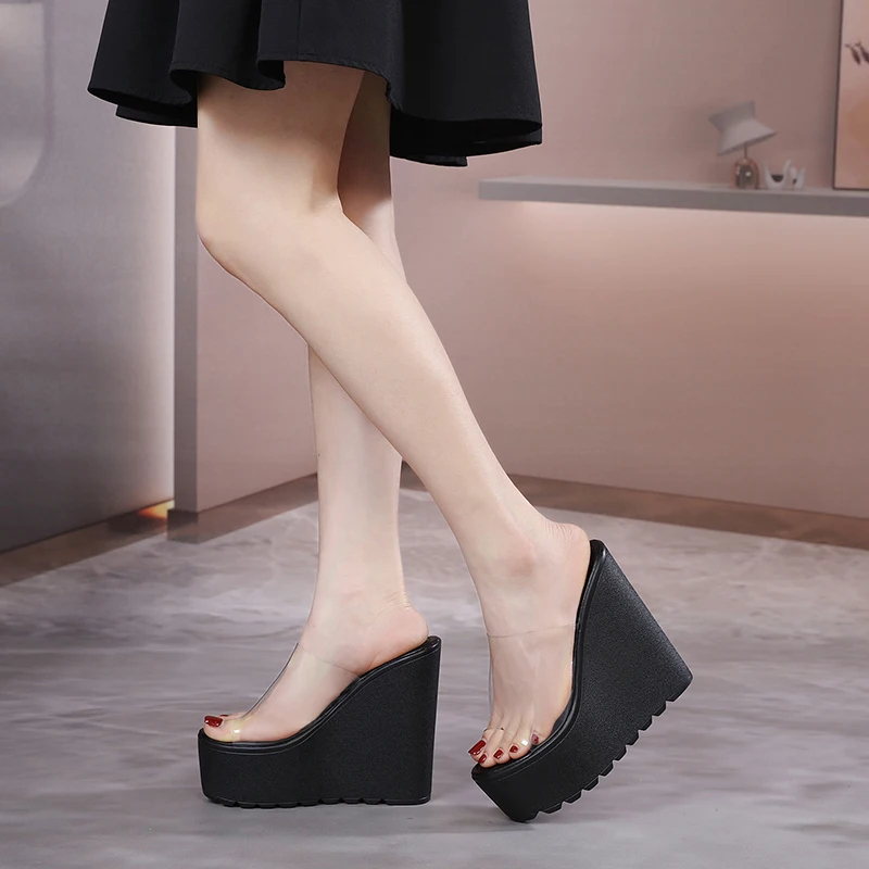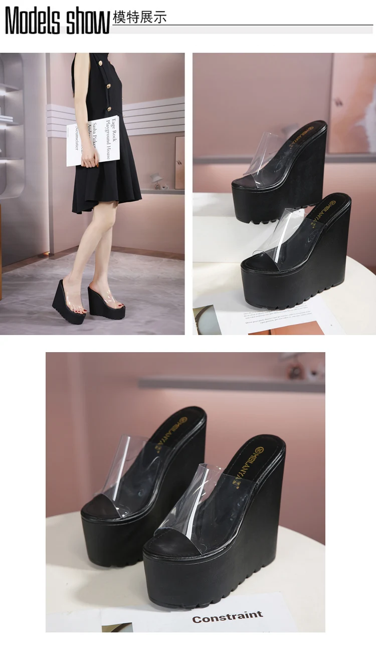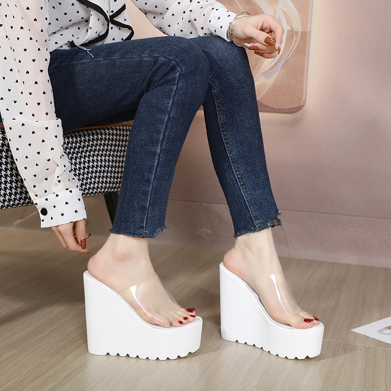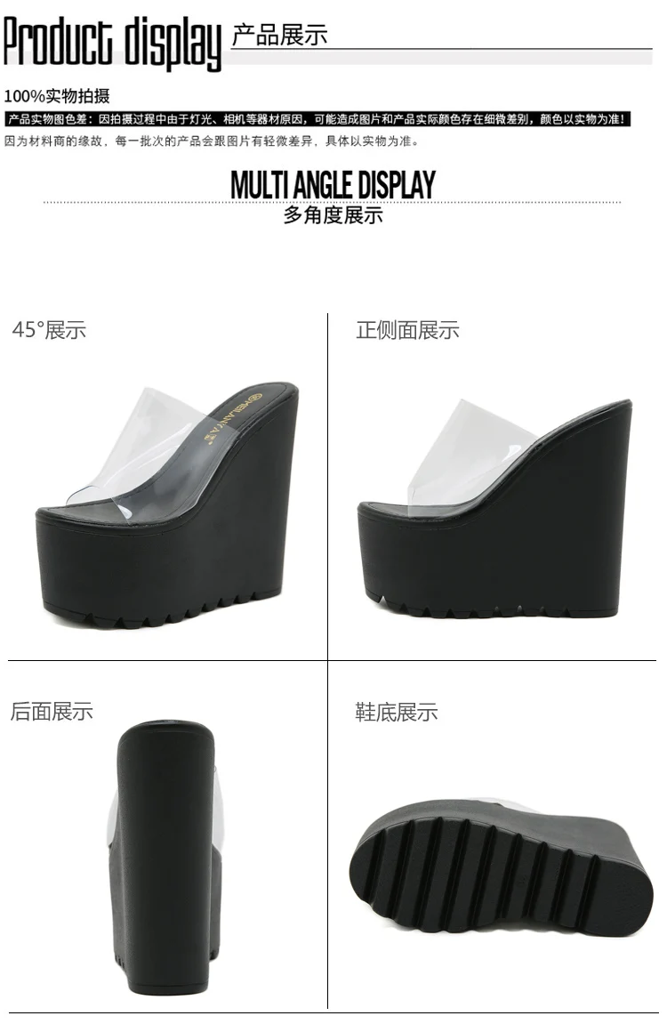 16CM Summer Concise Clear Transparent Peep Toe Platform Wedges Slippers Sandals Women Fashion High Heels Runway shoes
