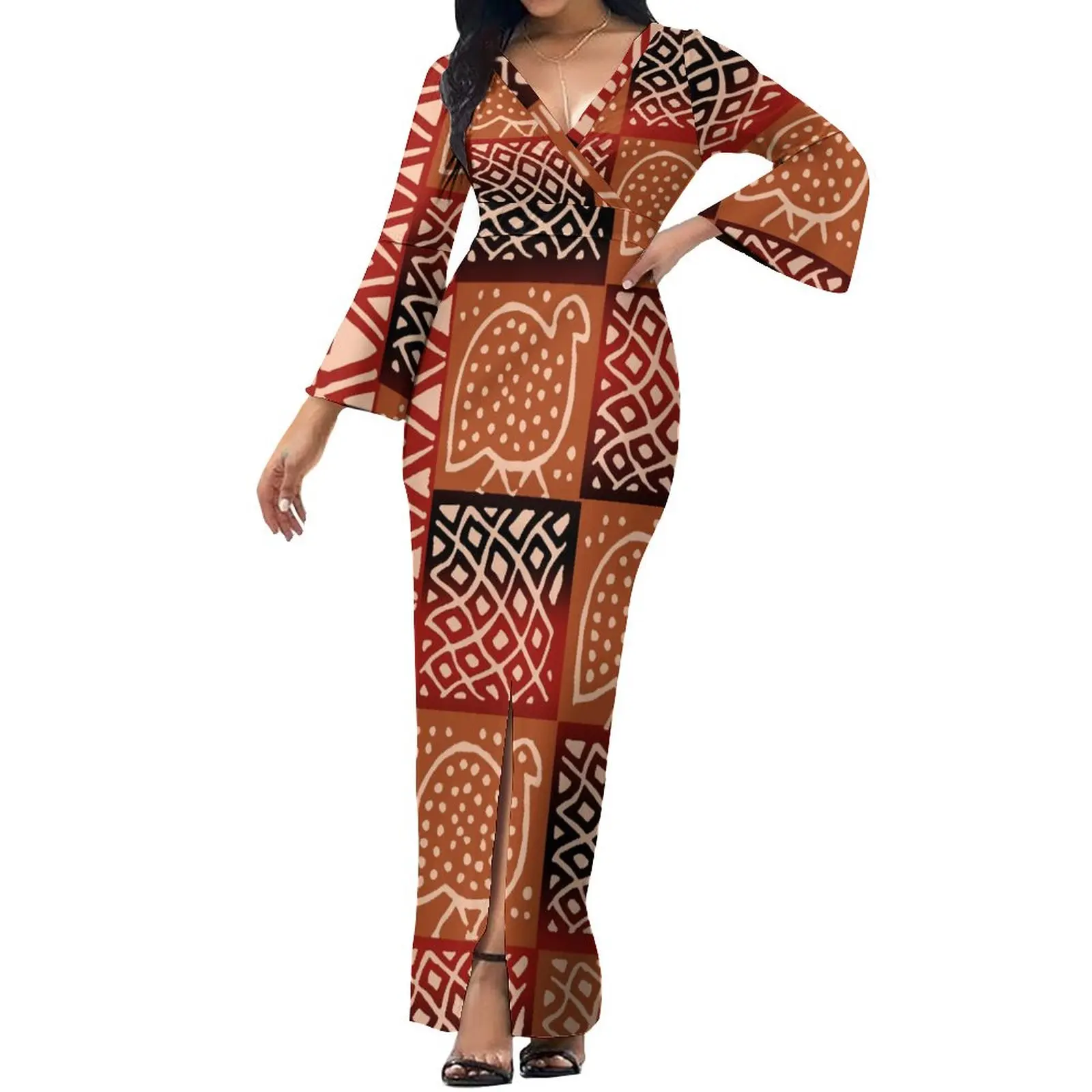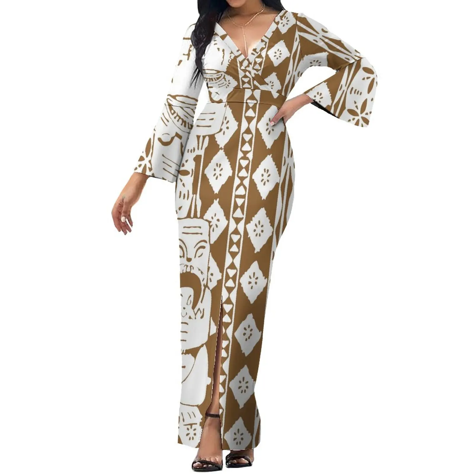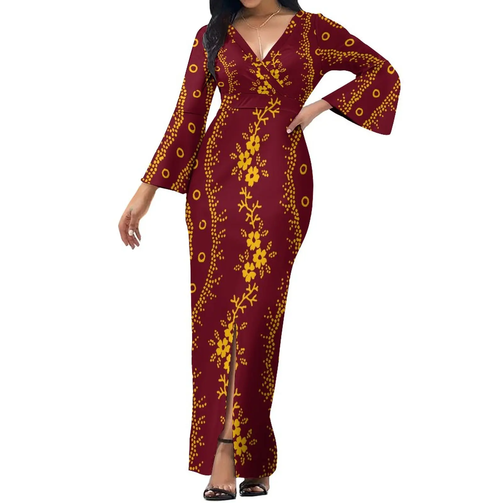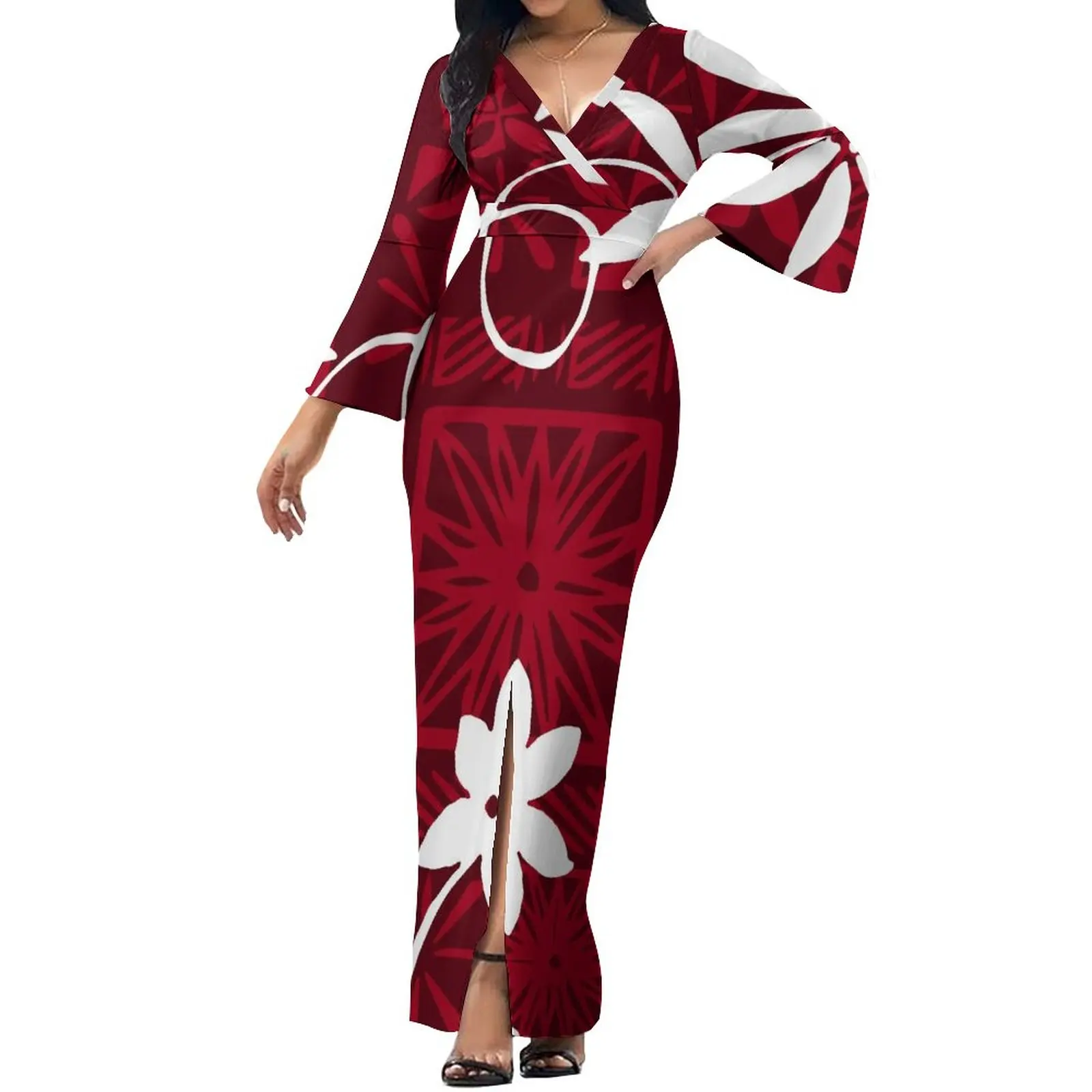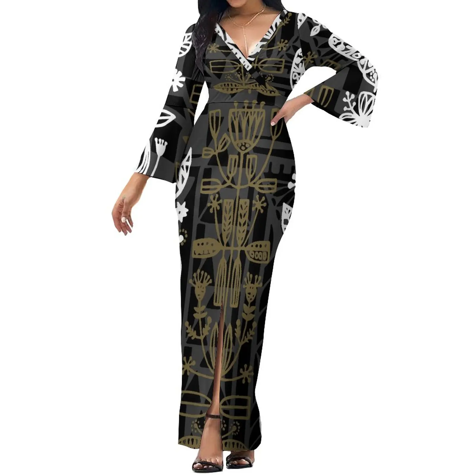 2023 Polynesian Women’s Dress Elegant V-neck Maxi Dress with Custom Patterned Temperament Party Summer Soft Fabric