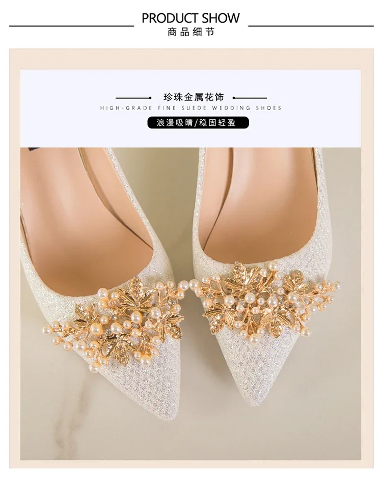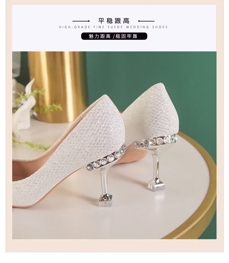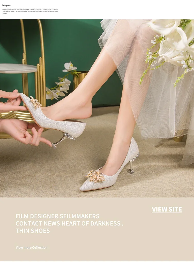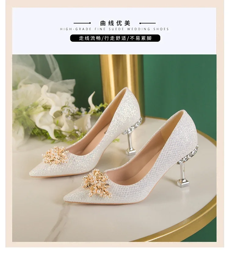 2025 New Wedding Bride Rhinestone Gold Fashion High Heels Metal Buckle Sexy Work Shoes 7cm Large Size Female Shoe High Heel