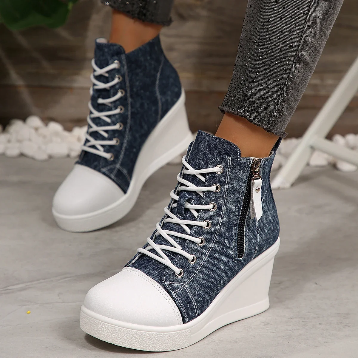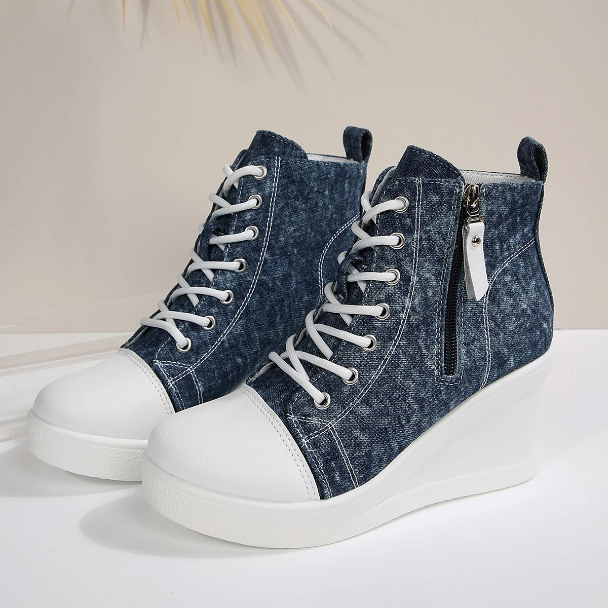 2025 New Women High Top Wedge Sneakers Blue Camouflage Shoes Woman Fashion Lightweight Lace Up Platform Ankle Sneakers Women