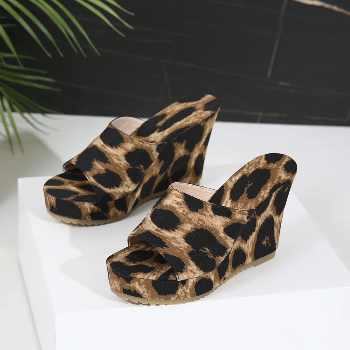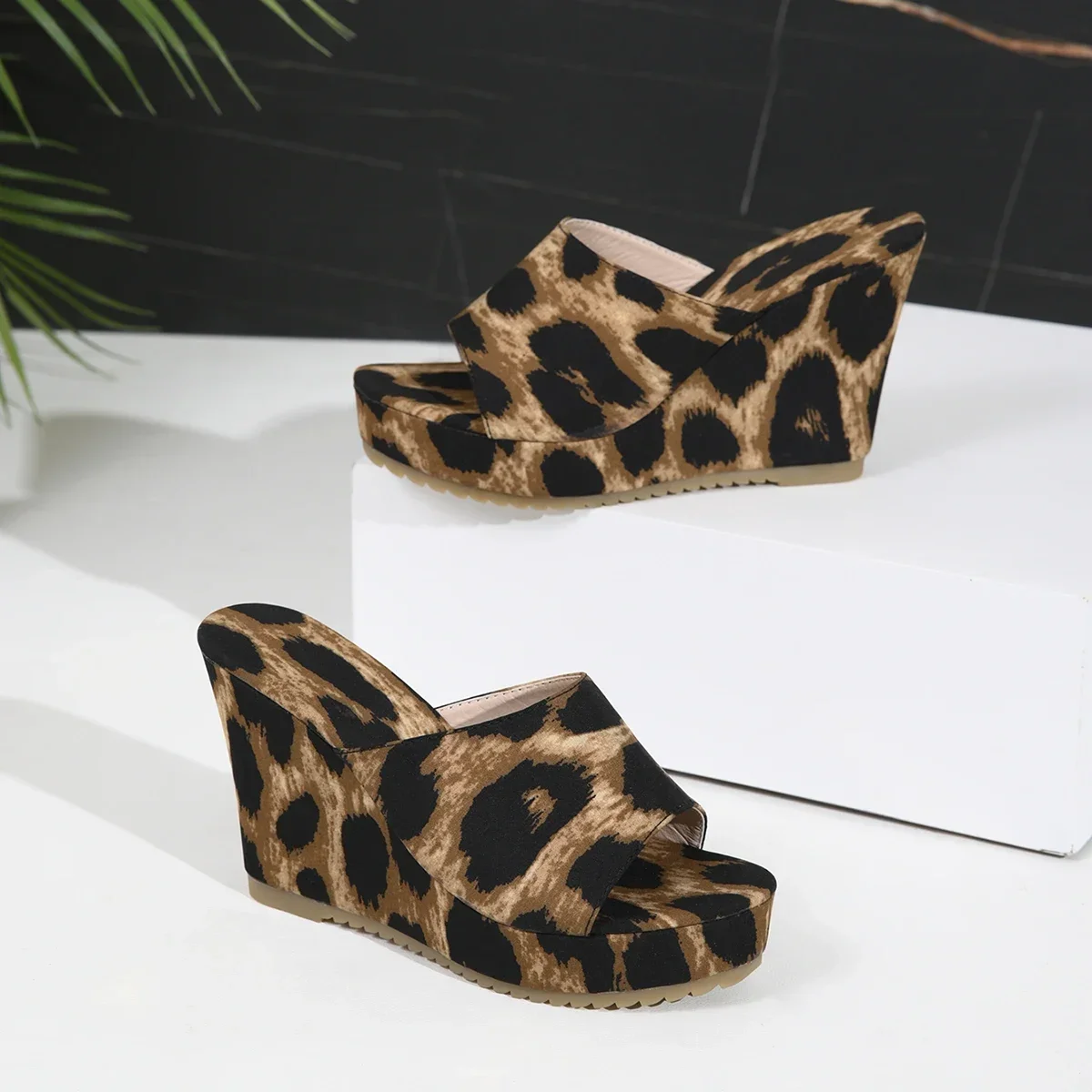 2025 Summer Women’s Shoes Fashion Open Toe High Heels Women’s Slippers Leopard Print Wedge Large Size Women’s Beach Shoes