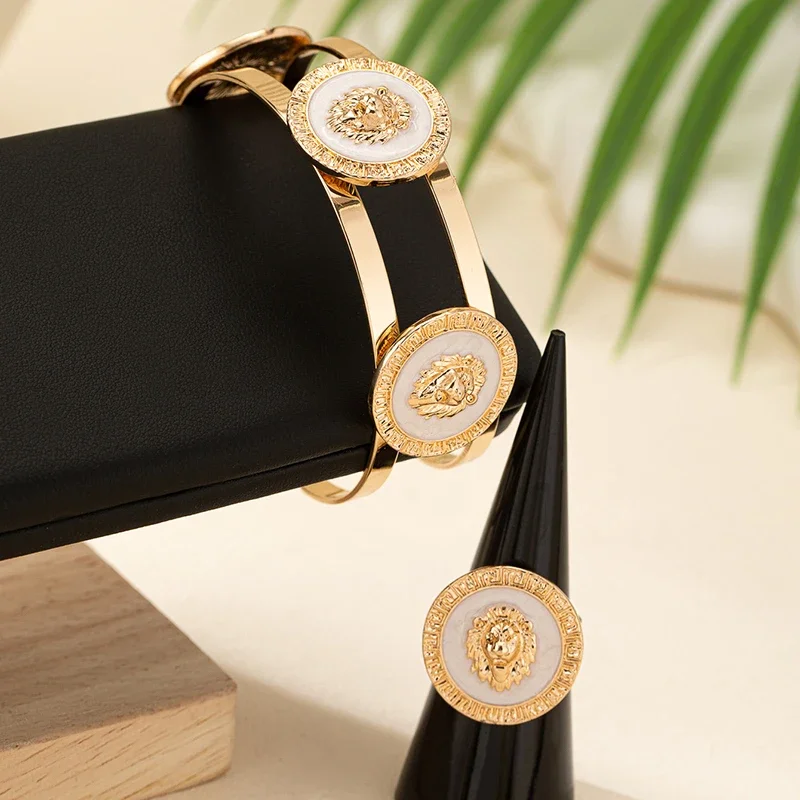 2PCS Jewelry Set Lion Head Stainless Steel Bracelet Bangle for Women Gold Plated Smooth Ring Punk Gifts