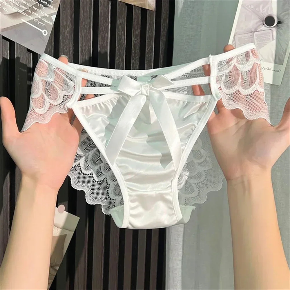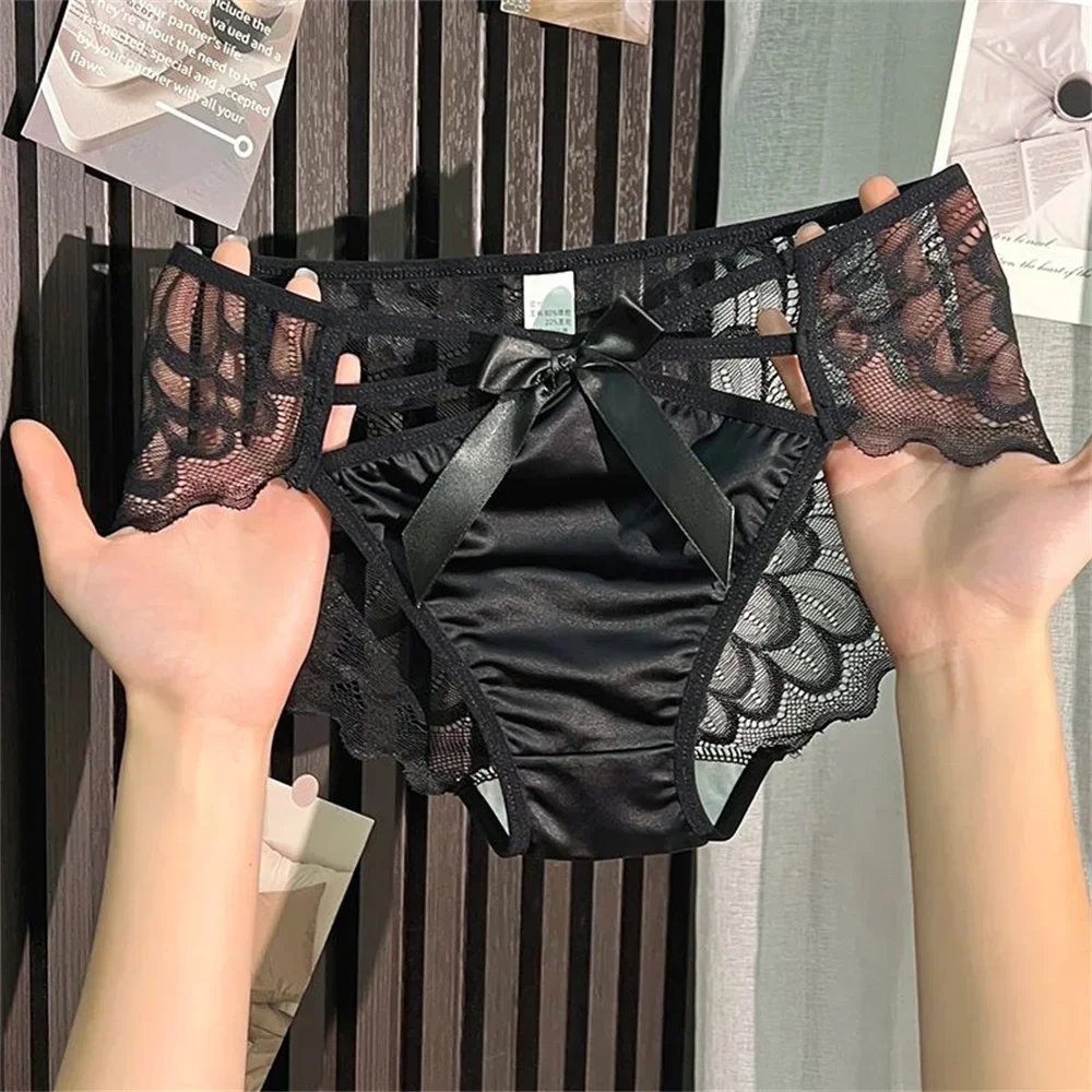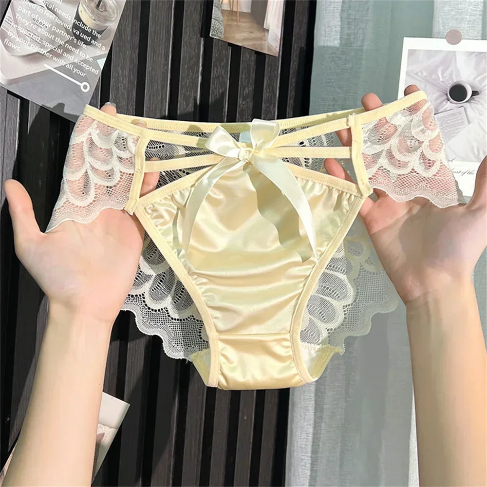 3PCS Big Bow Panties Hollow Out Floral Sexy Lace Satin Underwear Sweet Girls Panties Mid Waist Breathable Briefs