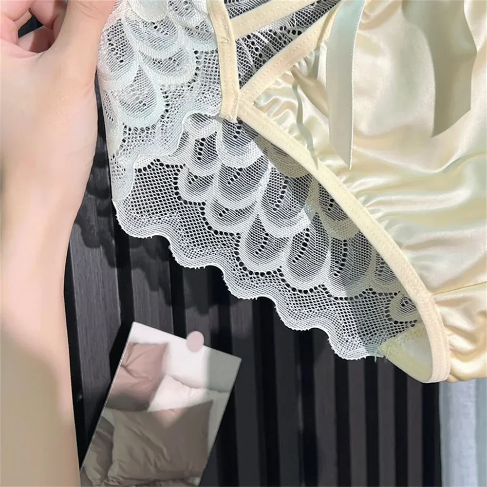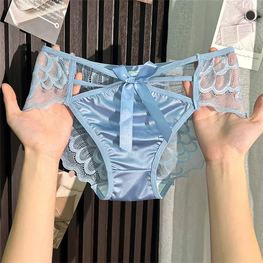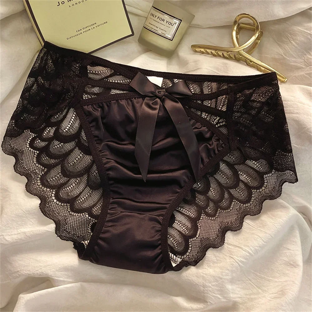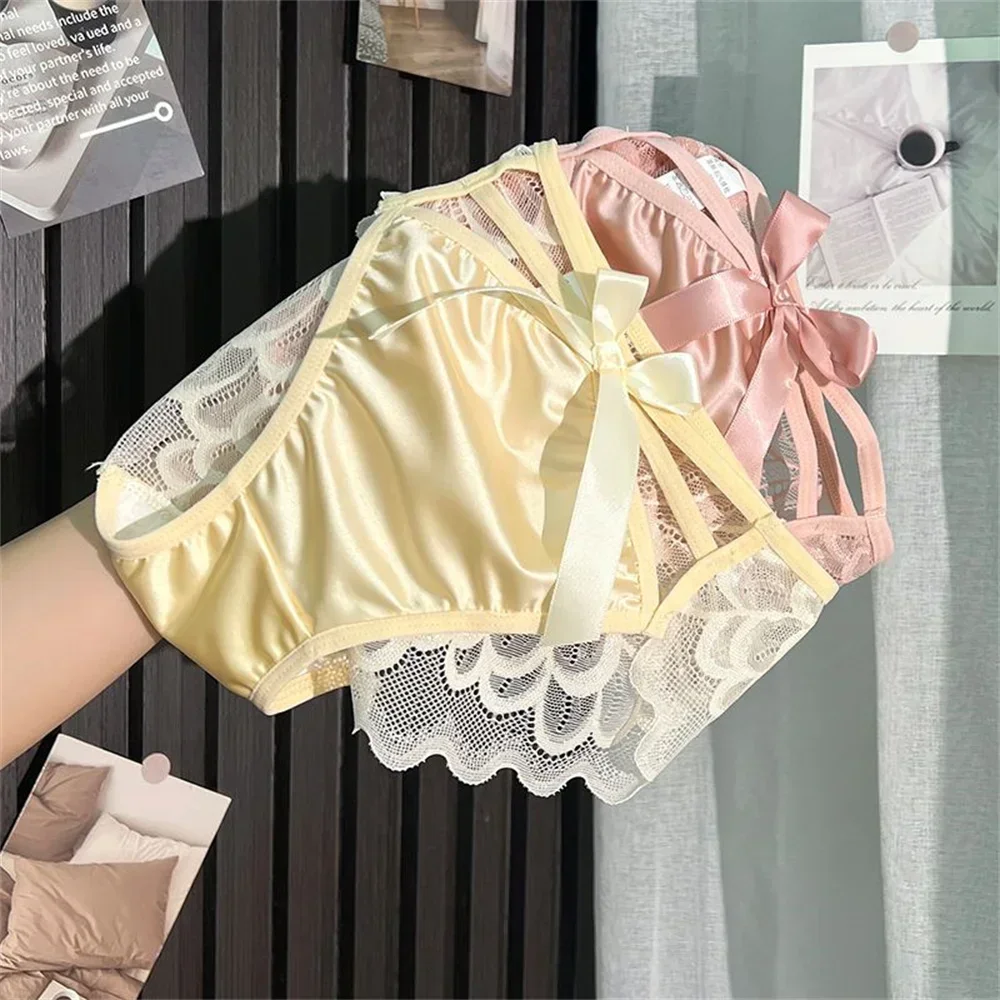 3PCS Big Bow Panties Hollow Out Floral Sexy Lace Satin Underwear Sweet Girls Panties Mid Waist Breathable Briefs