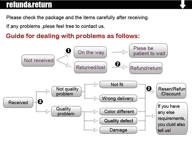 • If you did not receive the product within the guaranteed time( 45 days not including 2-5 day processing) you can request a refund or a reshipment.