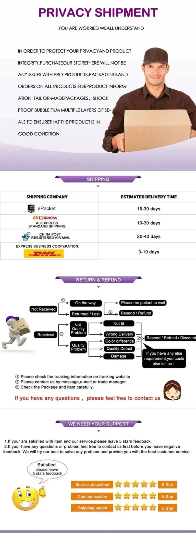 • If you did not receive the product within the guaranteed time( 45 days not including 2-5 day processing) you can request a refund or a reshipment.