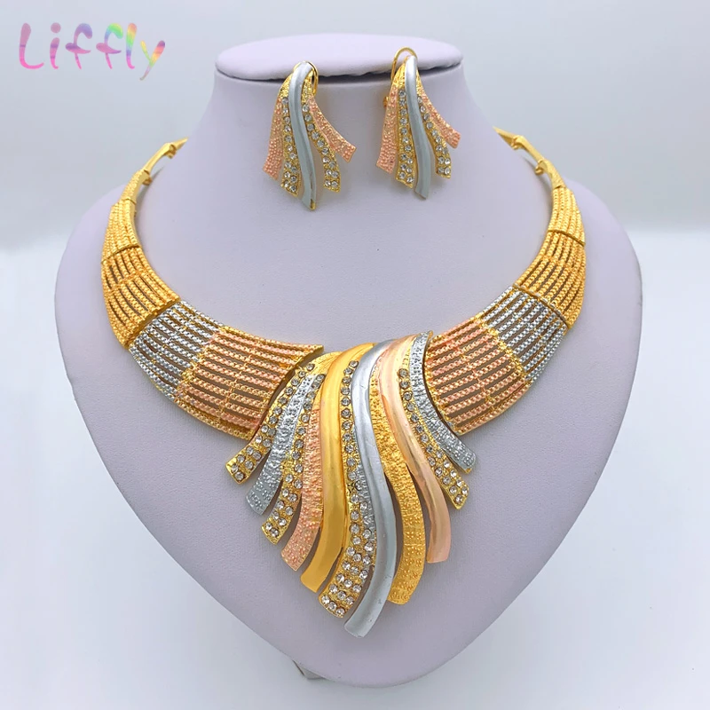 African Jewelry Dubai 24k Gold Jewelry Sets Bridal Wedding Big Crystal Choker Necklace Bracelet Earrings for Woman