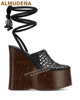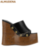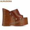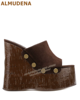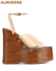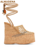 ALMUDENA Brown Cork Platform Wedged Sandals Transparent Pvc Buckle Strap Summer Dress Shoes Wooden Patter Sky High Banquet Pumps