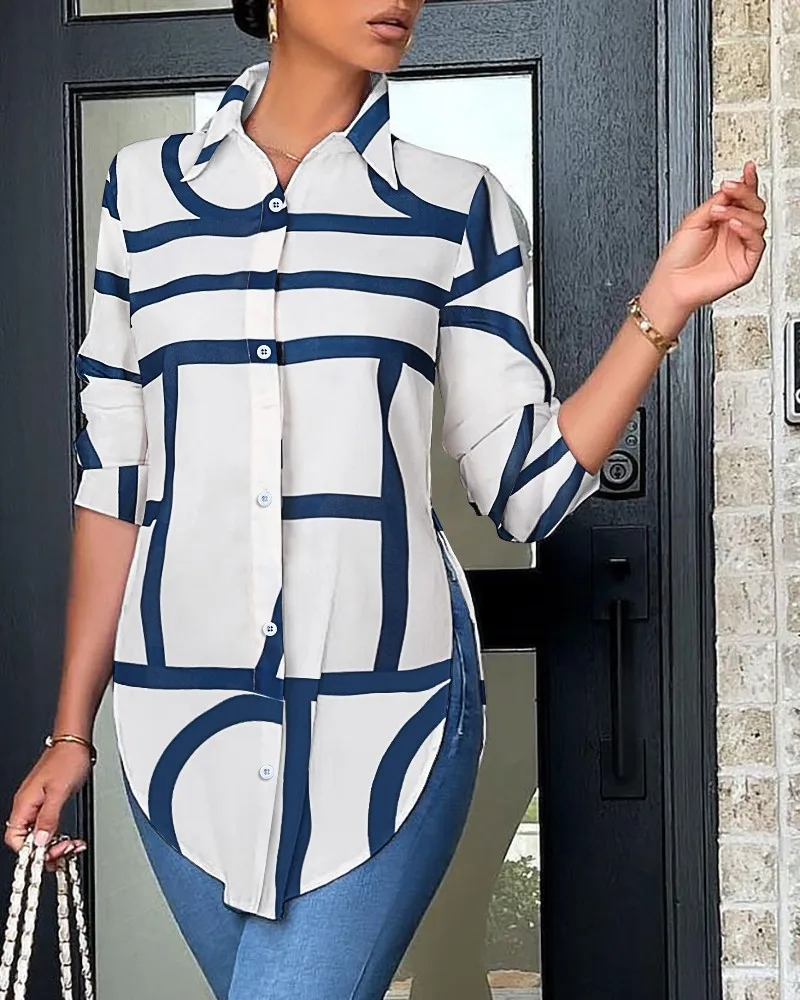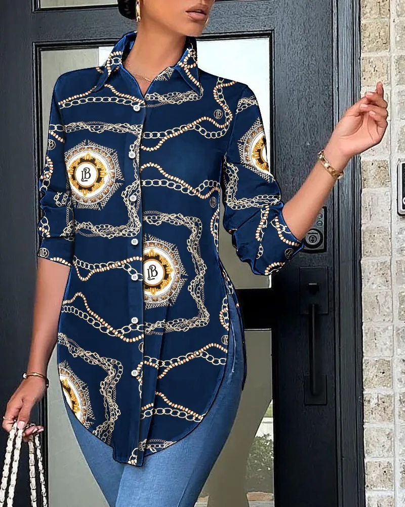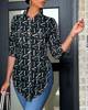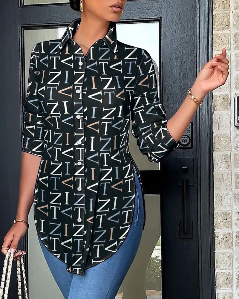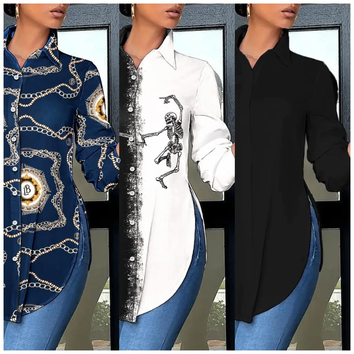Autumn Casual Shirt Women Turn Down Collar Print Long Sleeve Shirts Loose Casual Split Blouse Button Tops Office Ladies