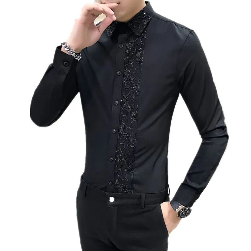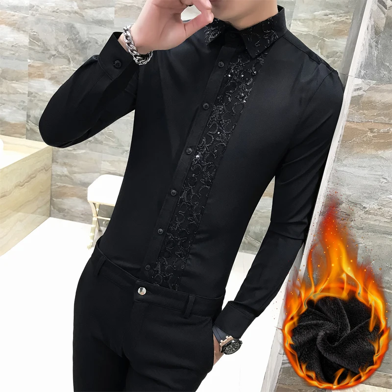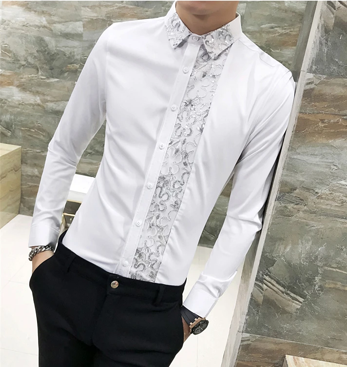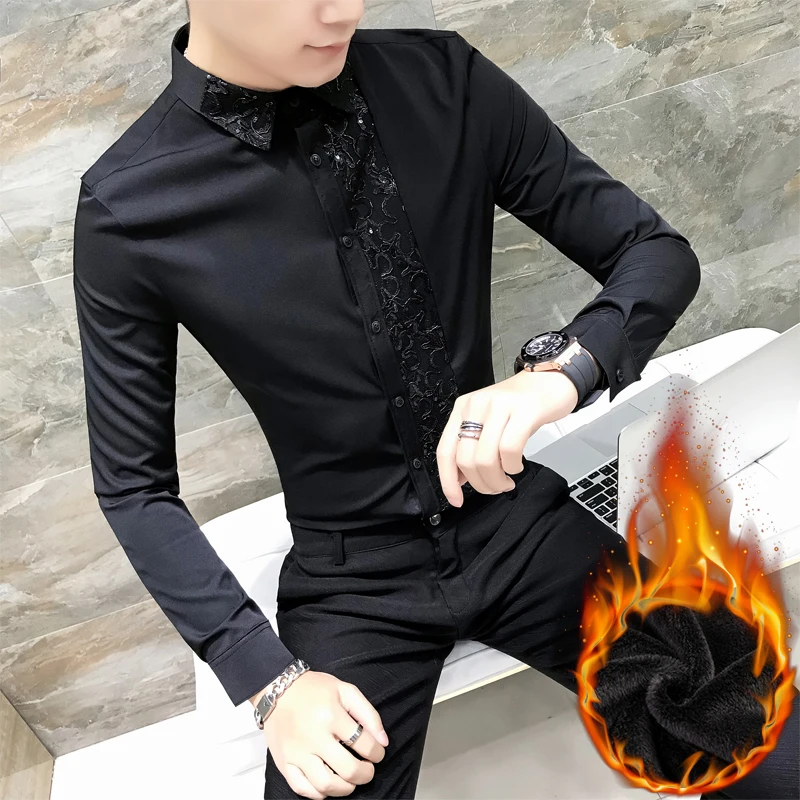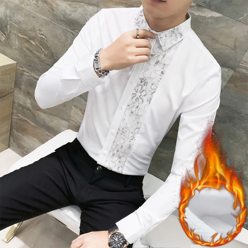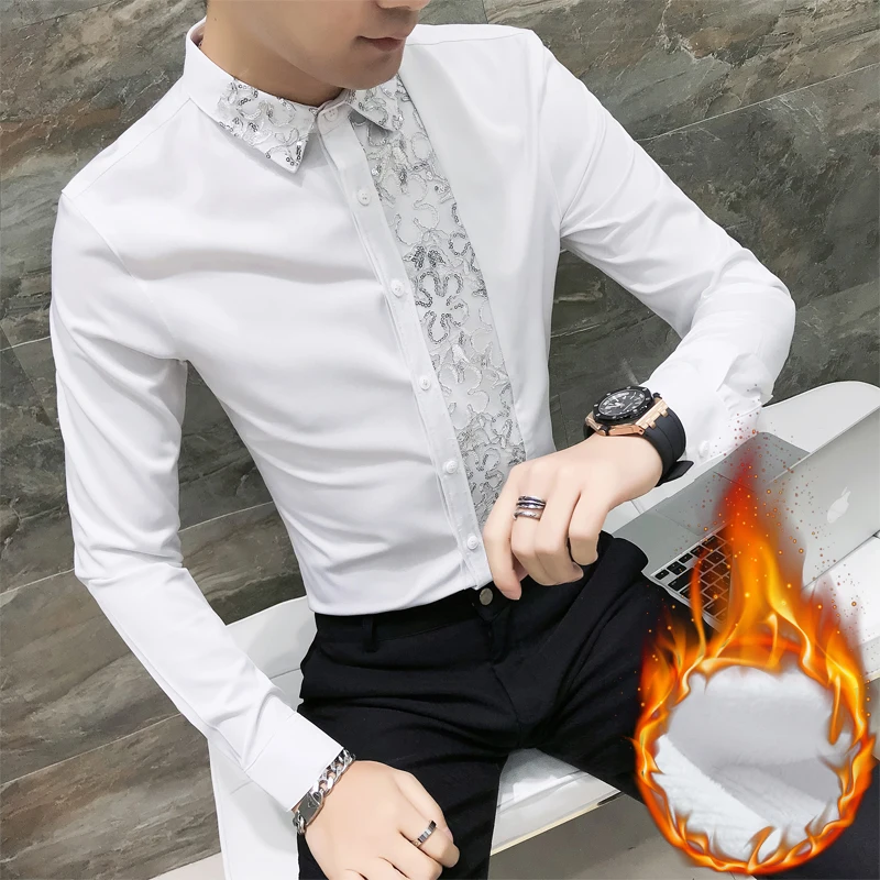 Autumn White Fleece Long Dress Shirt Men’s, Fashion Slim Men Shirts,QJ CINGA Brand New Male Top Lace Stitching Decoration Camisa
