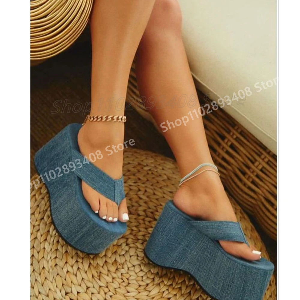 Blue Demin Flip Flops Slippers Thick Soled Elegant Fashion Slip-on Wedges High Heel Women Shoes 2025 Spring Zapatos Para Mujere
