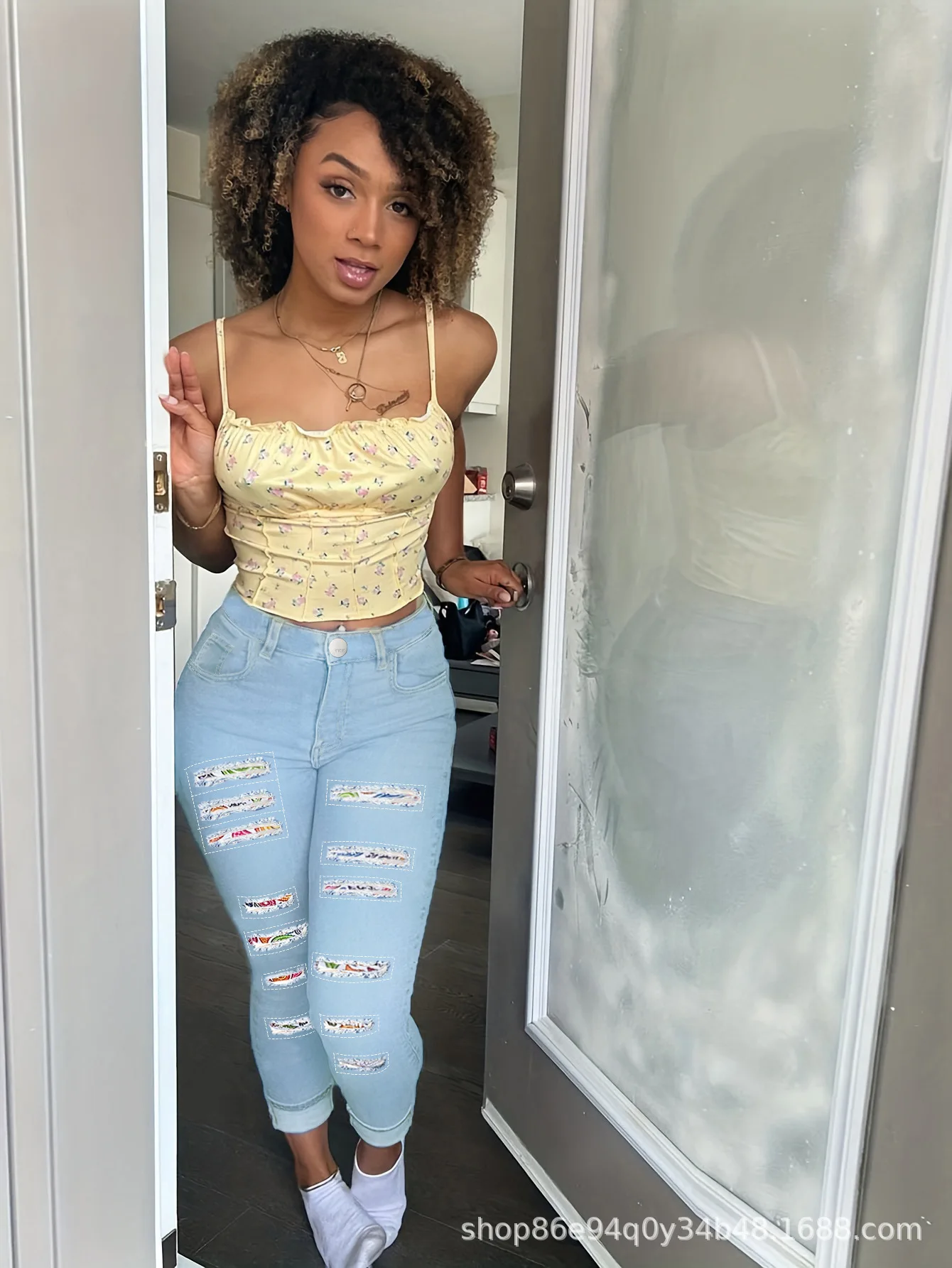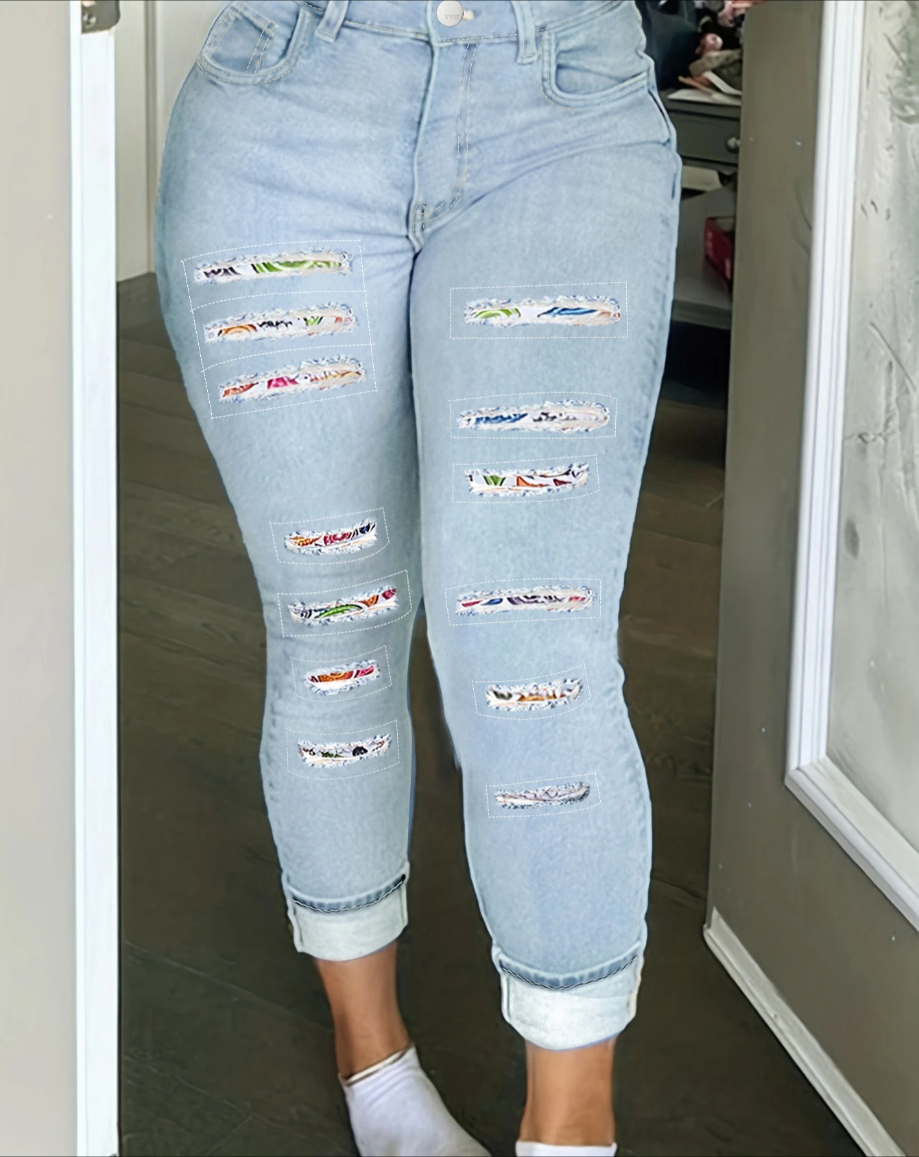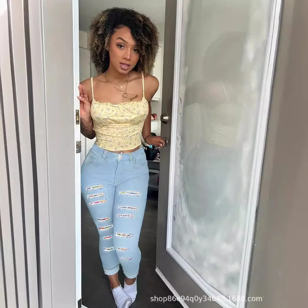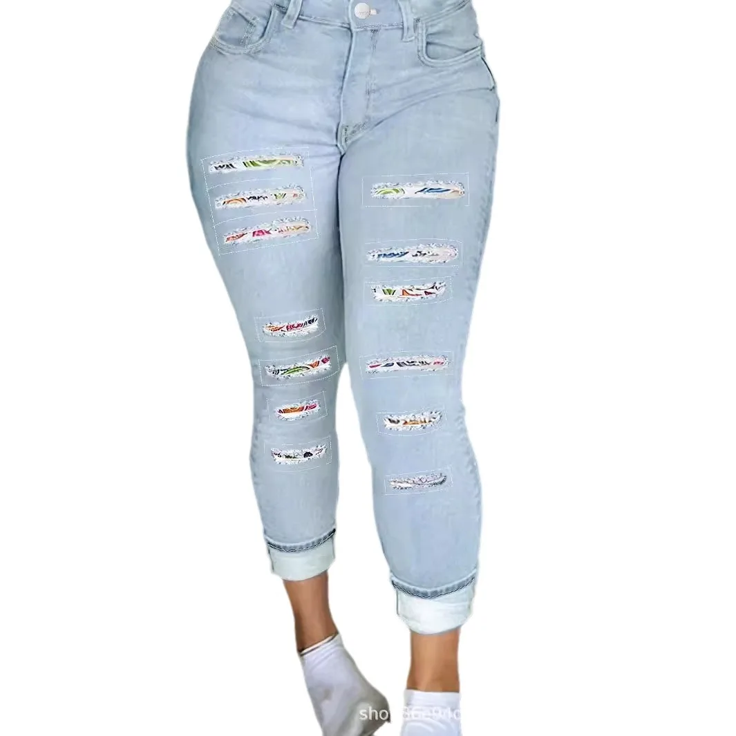Bodycon Pencil Jeans Women Holes Splice High Waist Trousers Row Denim Pants Big Size Skinny Ankle Lenth 2025 Spring Mom Jeans