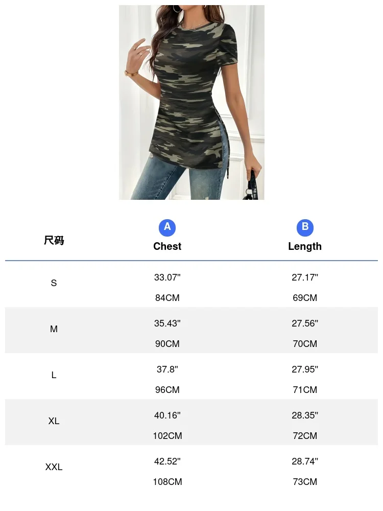 Camo Print Crew Neck Split Tunics Casual Short Sleeve