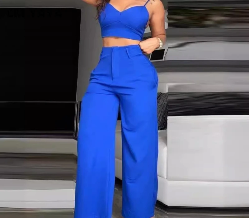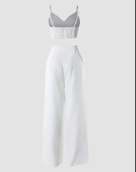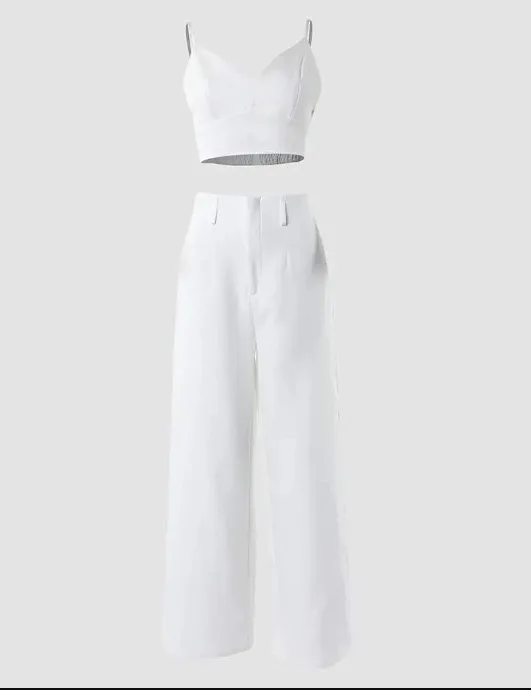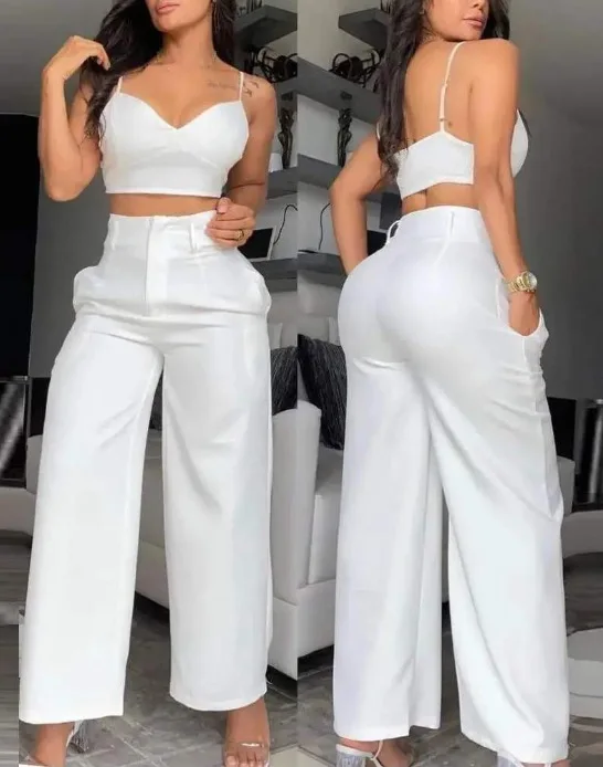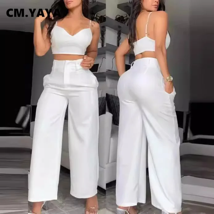 CM.YAYA Fashion Women’s Set Spaghetti Strap V-neck Crop Top and Wide Leg Pants 2024 Party Two 2 Piece Sets Outfits Tracksuit