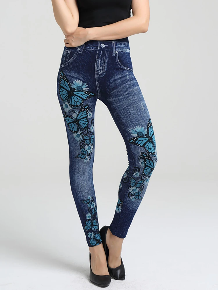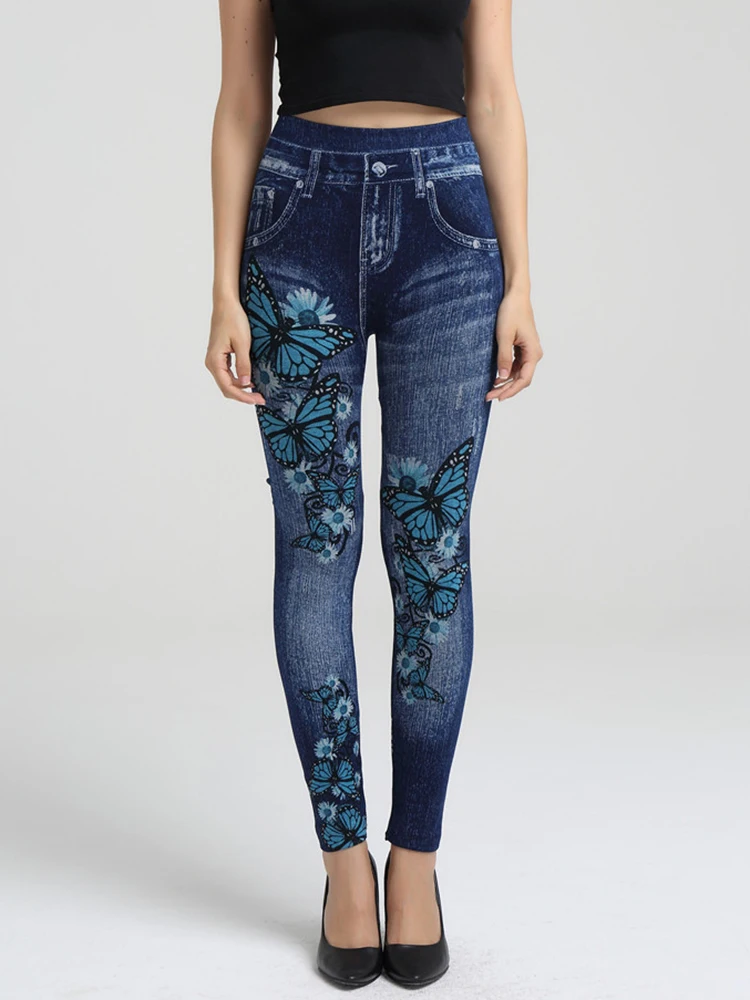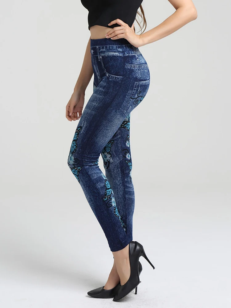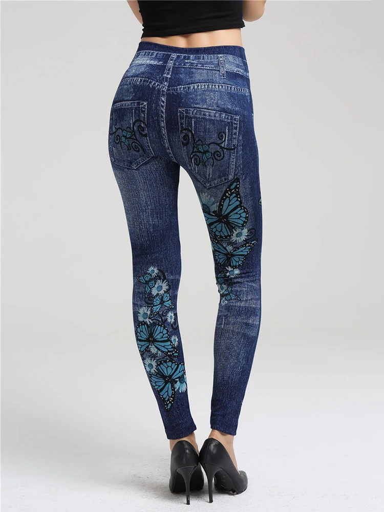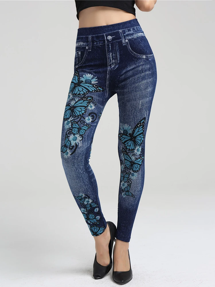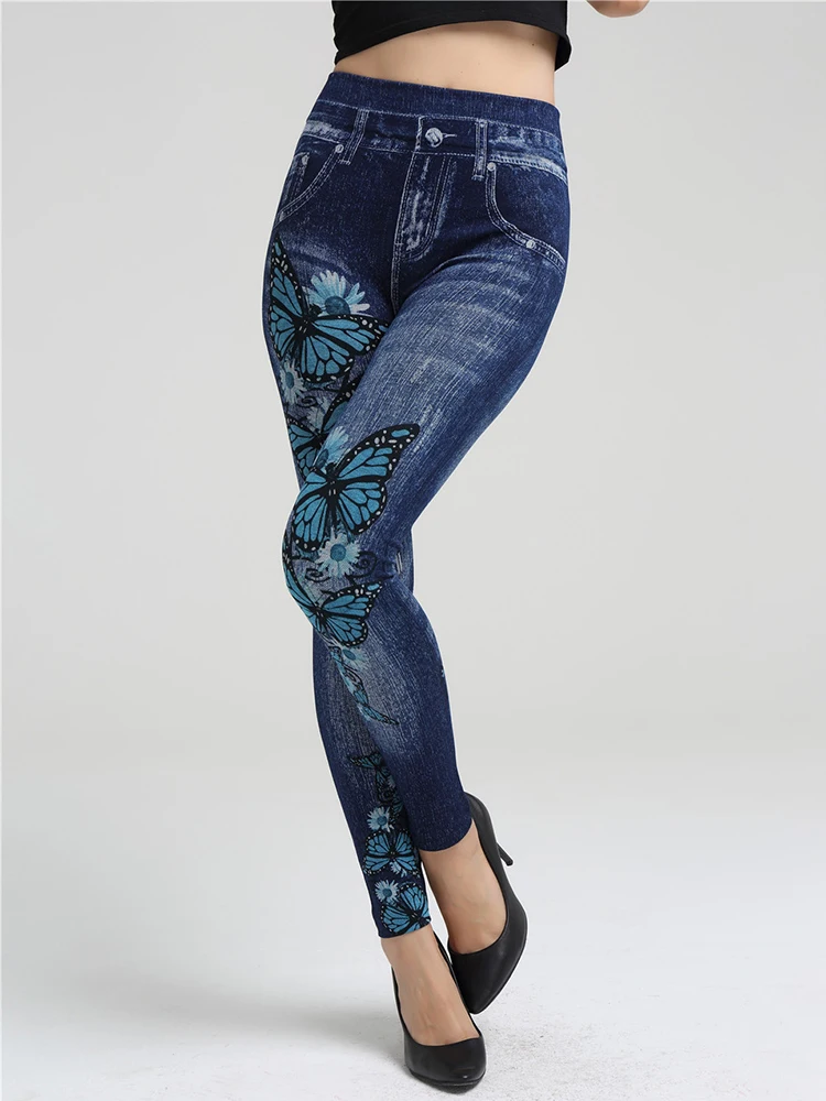 CUHAKCI High Elastic Blue Butterfly Print Leggings Plus Size Vintage Fake Jeans Women Jeggings Soft Fitness Trouses Sport Pants