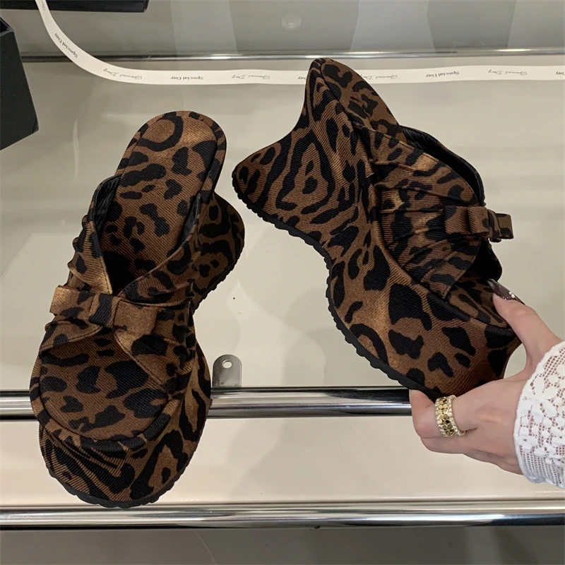 Eilyken Sexy Leopard Print Butterfl-Knot Platform Wedges Women’s Slippers Street Style Summer High Heels Banquet Shoes