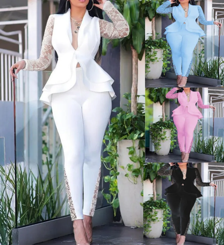 Elegant Two Piece Set Women Office Suits Spring Autumn Lace Sleeve Slim Coat Top + Pencil Pants Sets Female Fashion 2 Piece Set