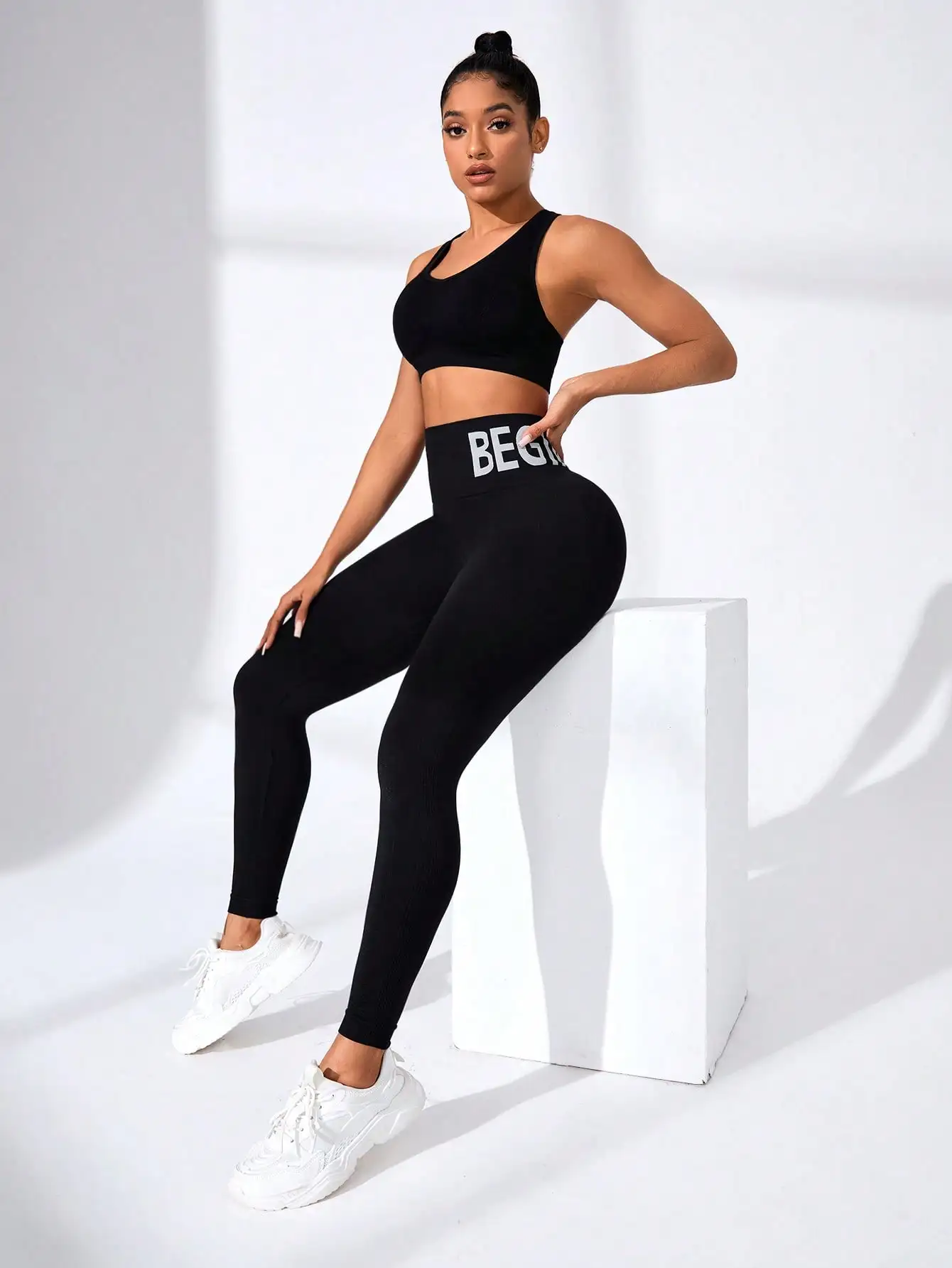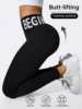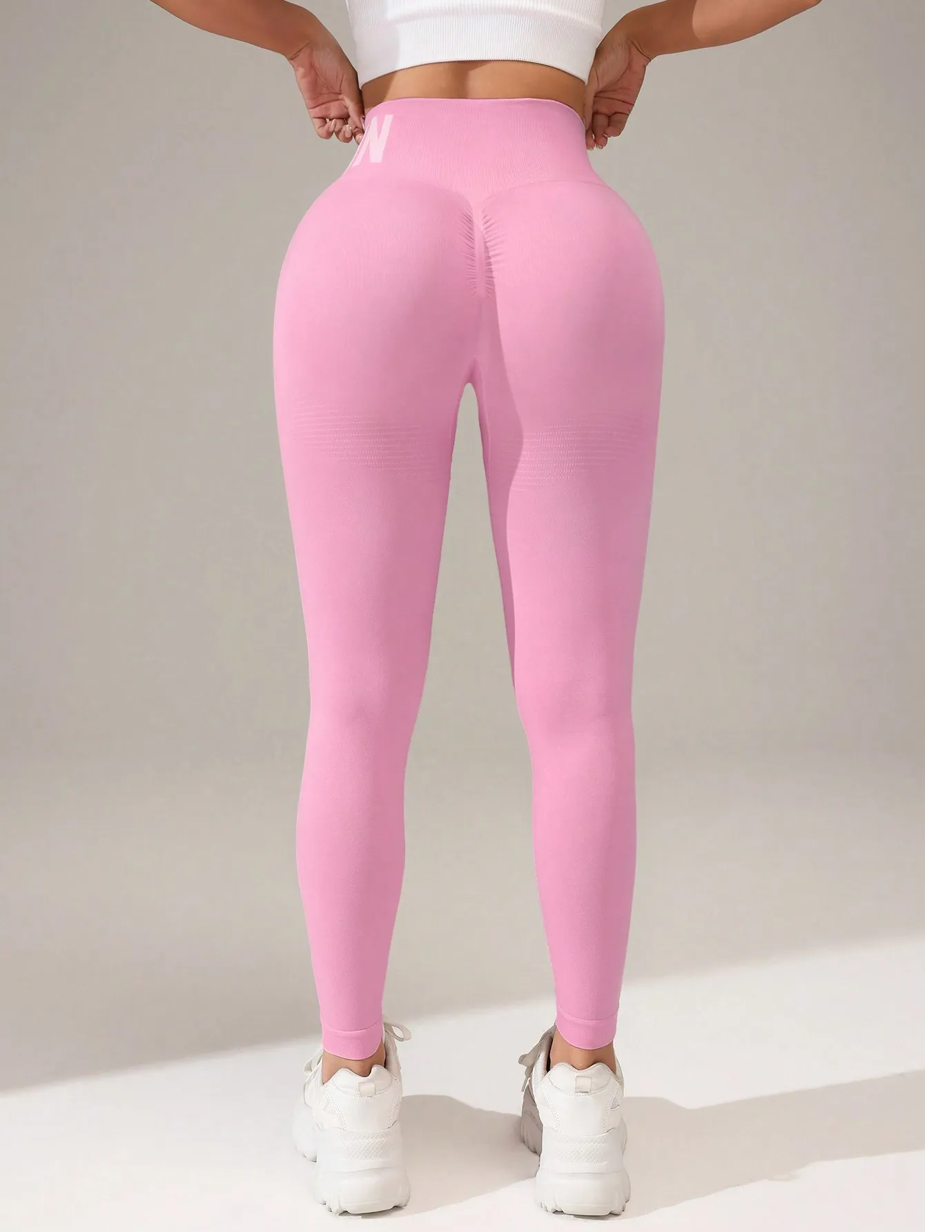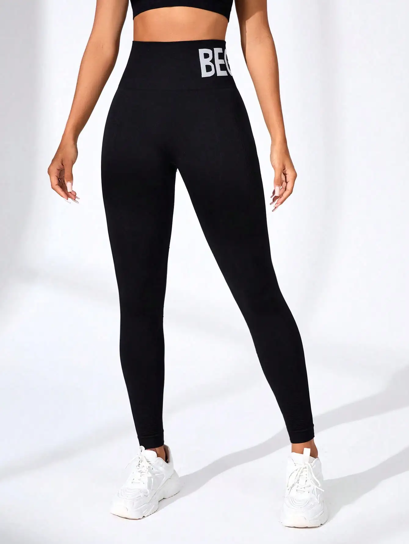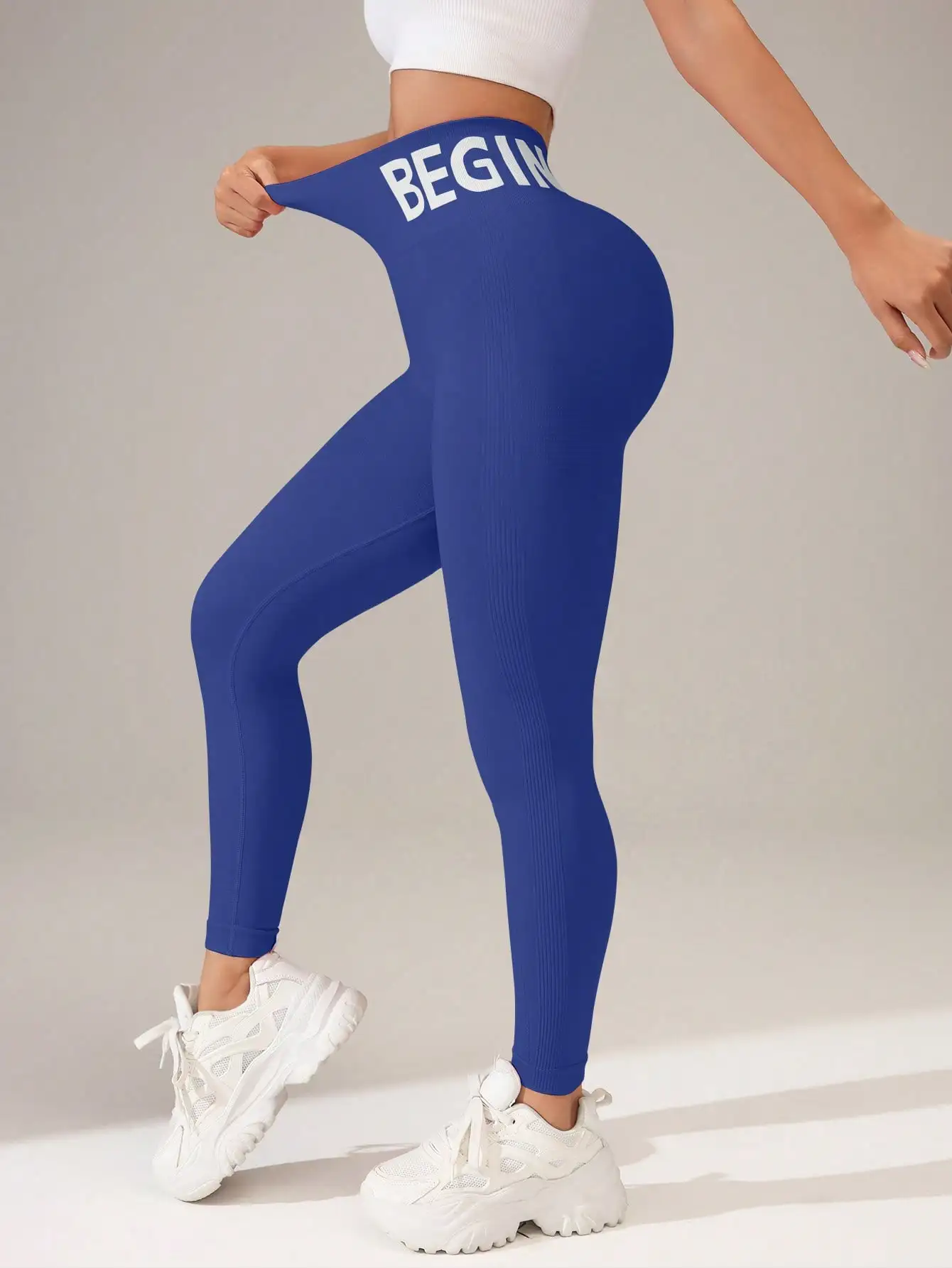 European and American Seamless Yoga Leggings with Waistband Lettering, Butt-Lifting, Quick-Dry Women’s Breathable Tights for Pea